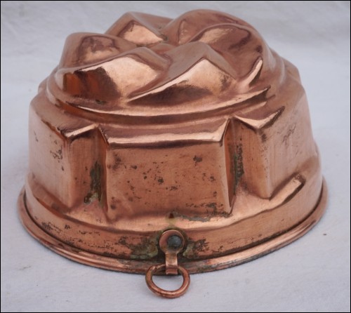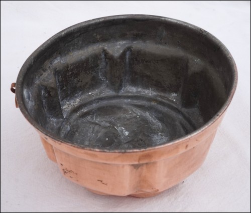 Moule à gateau ou brioche en cuivre étamé. Diamètre 15.2cm, hauteur 8.8cm, poids 215gr. Bel état, avec un anneau de suspension.