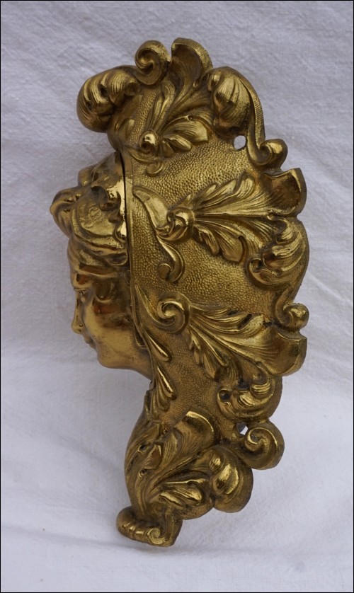 Victorian brass drop pocket corner plate of billiard table with the shape of Indian lady face made late 19th century. It's complete, the weighted hinged drop plate works perfectly.8 " (20.3cm) height, 4 3/4" (12cm) depth, 4 1/2" (11.5cm) width, weight 2lb 2.92oz (1 kilogram). Beautiful polish patina as shown by the following pictures.