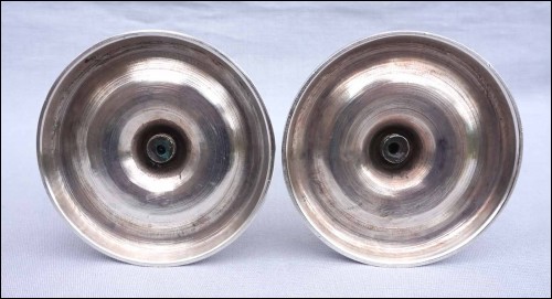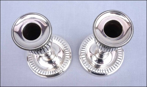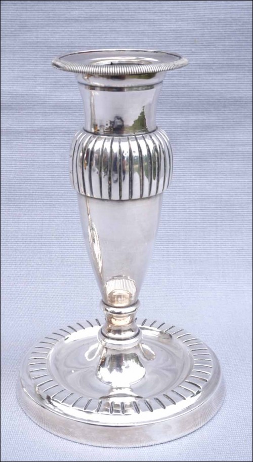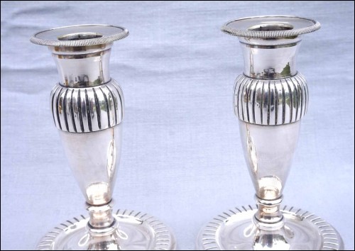 Paire de bougeoirs en métal argenté guilloché début XIX° siècle. Hauteur 13.1cm, diamètre à la base 8.5cm. Parfait état.
