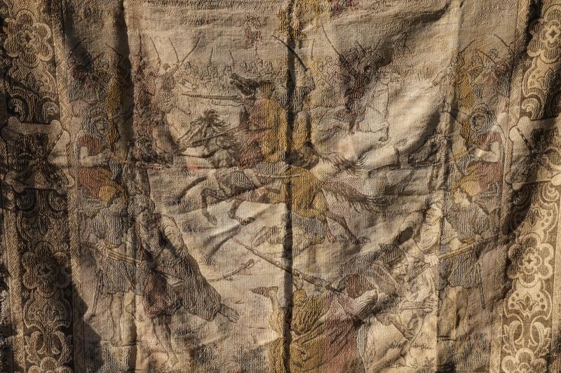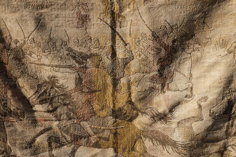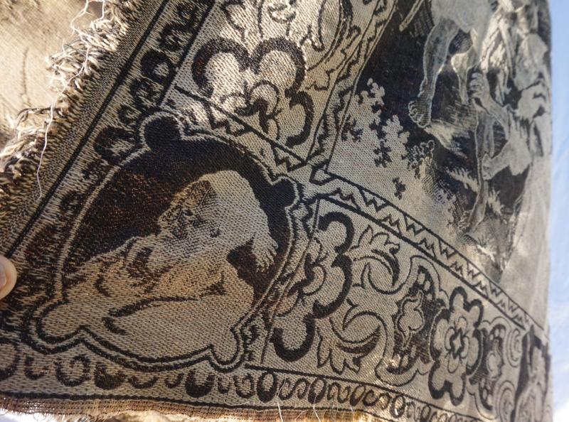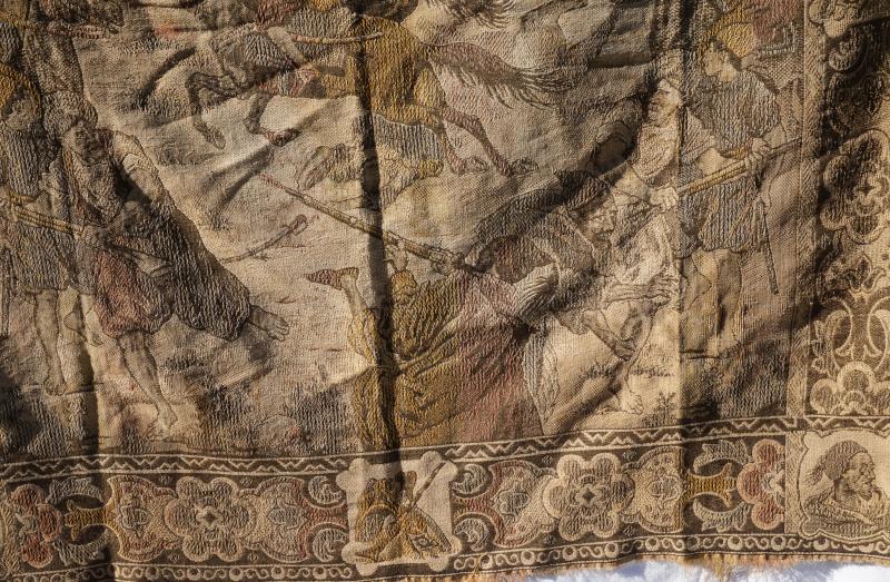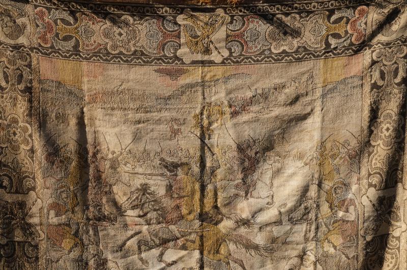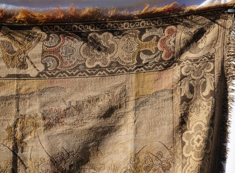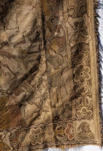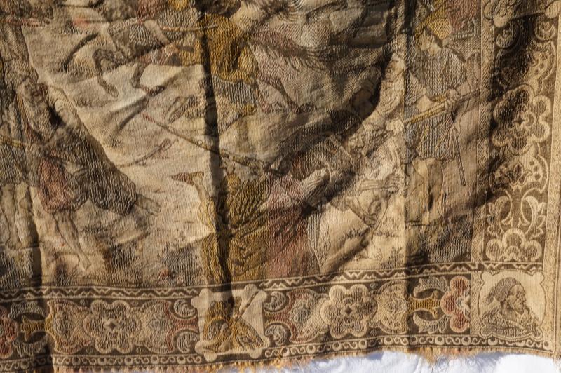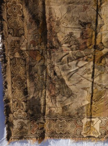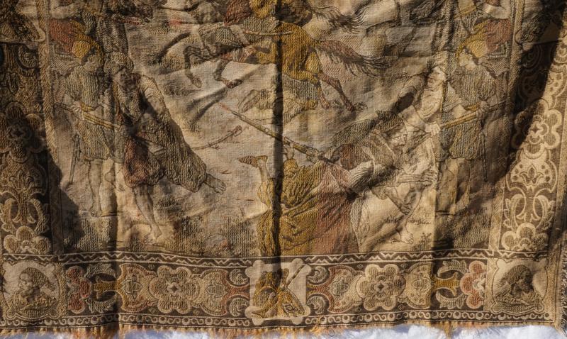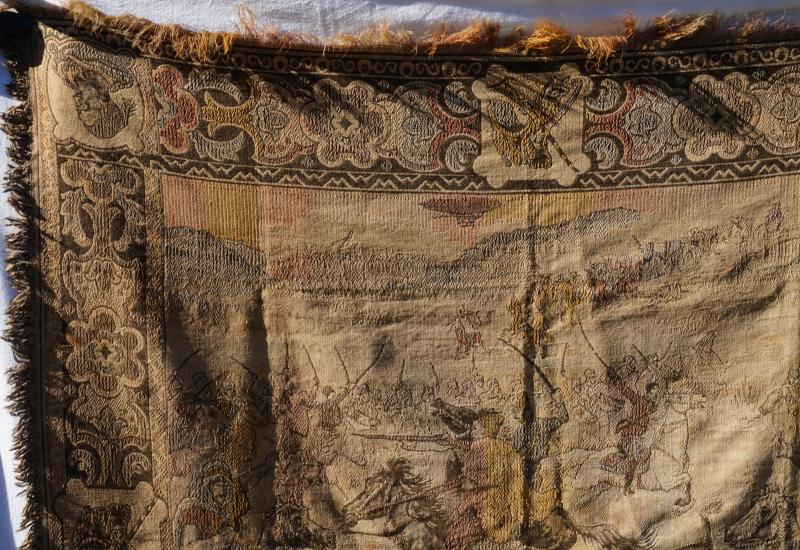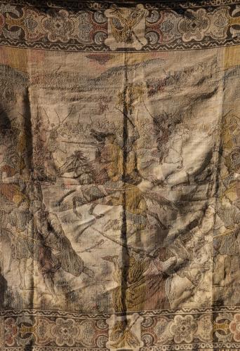Tenture murale en laine de chèvre et fibre végétal représentant la bataille de Tobrouk ou bataille de la colline de Nadura (Octobre 1911) au centre le capitaine Mustafa Kemal, qui deviendra Ataturk, soutenu par le cheik Muberra et la tribu Meryemet, dans le ciel un ballon dirigeable italien d'observation. Hauteur 126 cm, largeur 120 cm. Très bel état.