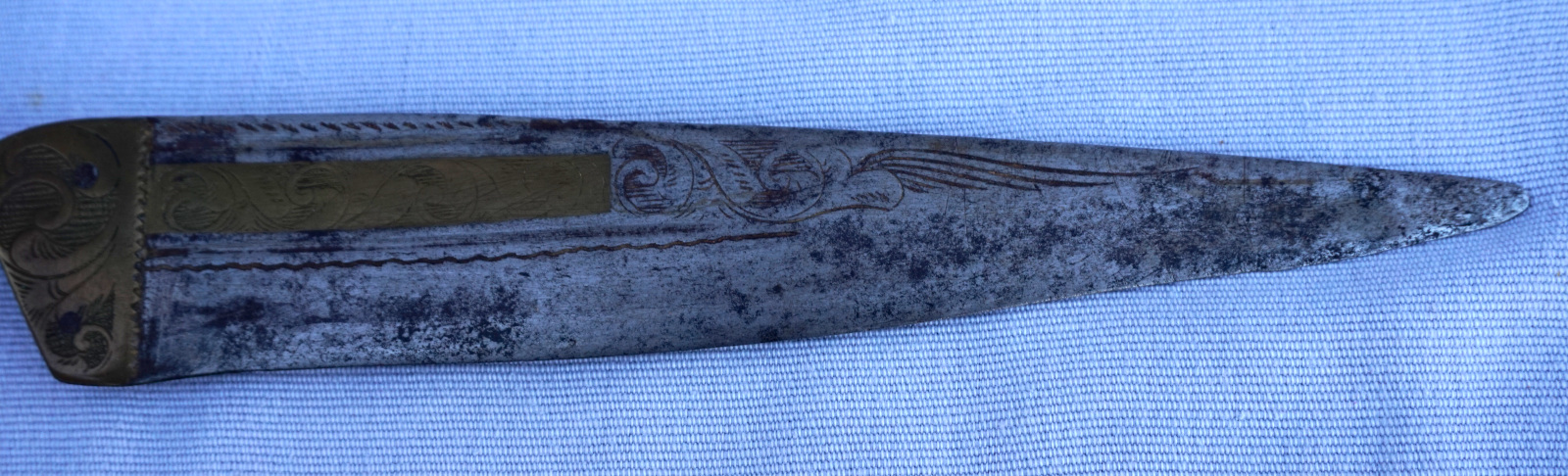 Antique hunting dagger in wrought iron with engraved inlayed brass made in Malaga Andalusia , 18th century. 12 1/4" (31.2cm) length. Beautiful condition.