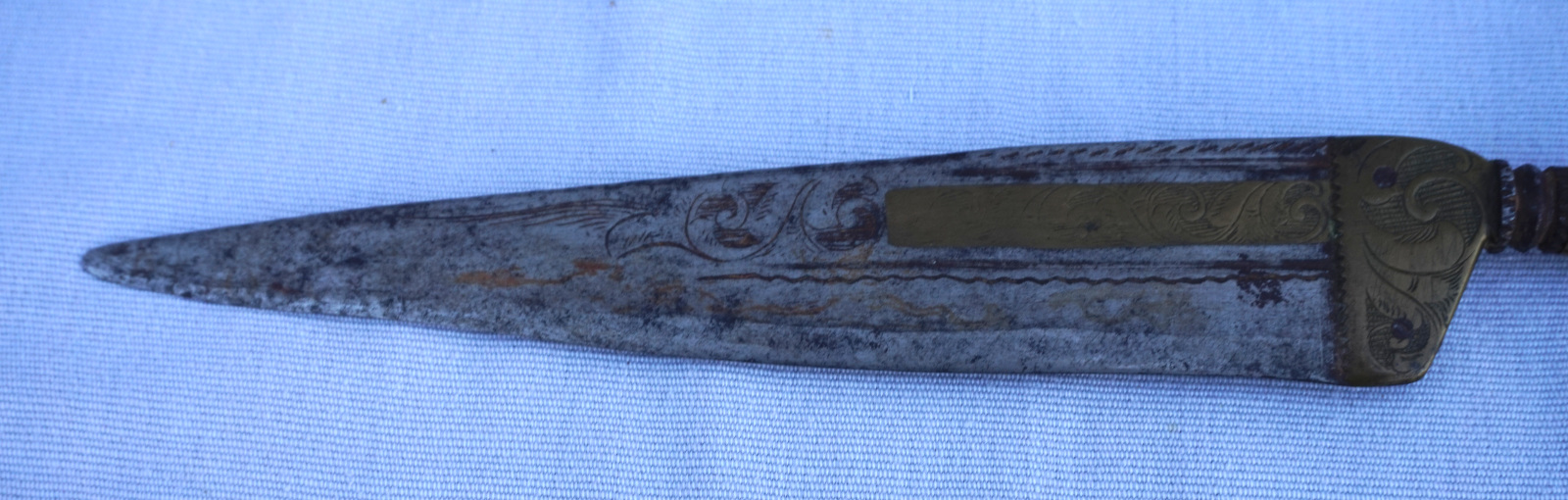 Dague de chasse, Puna espagnole, Malaga, avec inclusions et gravures, XVIII° siècle. Longueur 31.2cm. Très bel état.