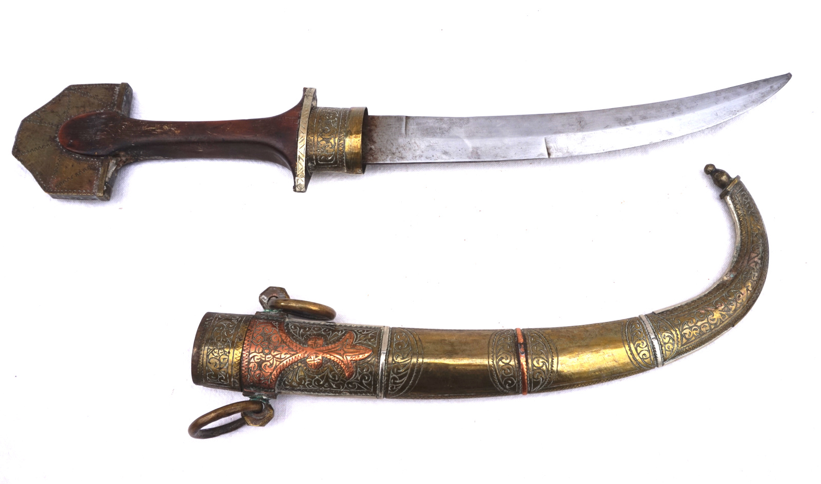 Moroccan dagger sword with horn handle and brass, copper and brass scabbard made during the first half of the 20th century. 17" (43.2cm) total length, 8 1/4" (21cm) blade length.