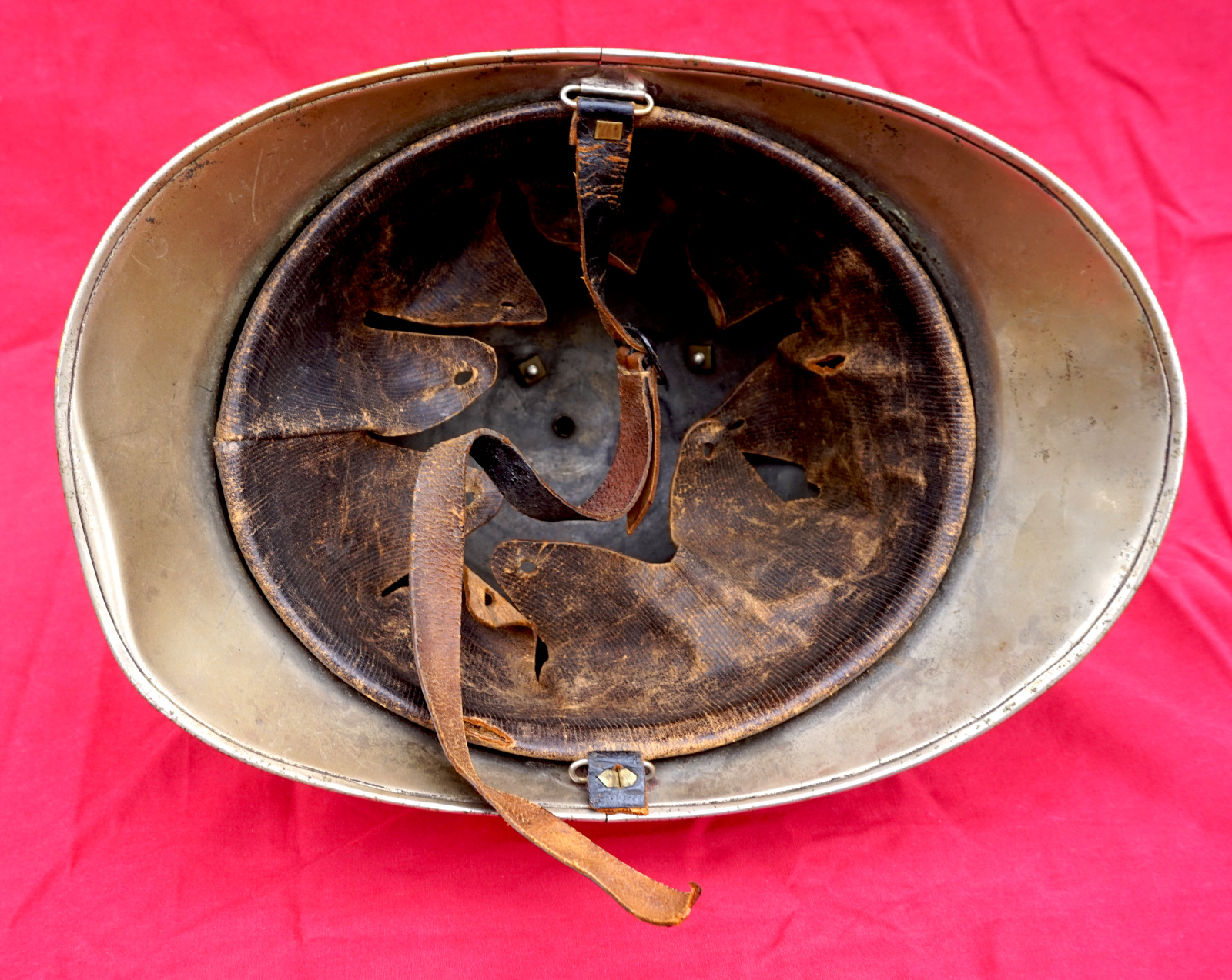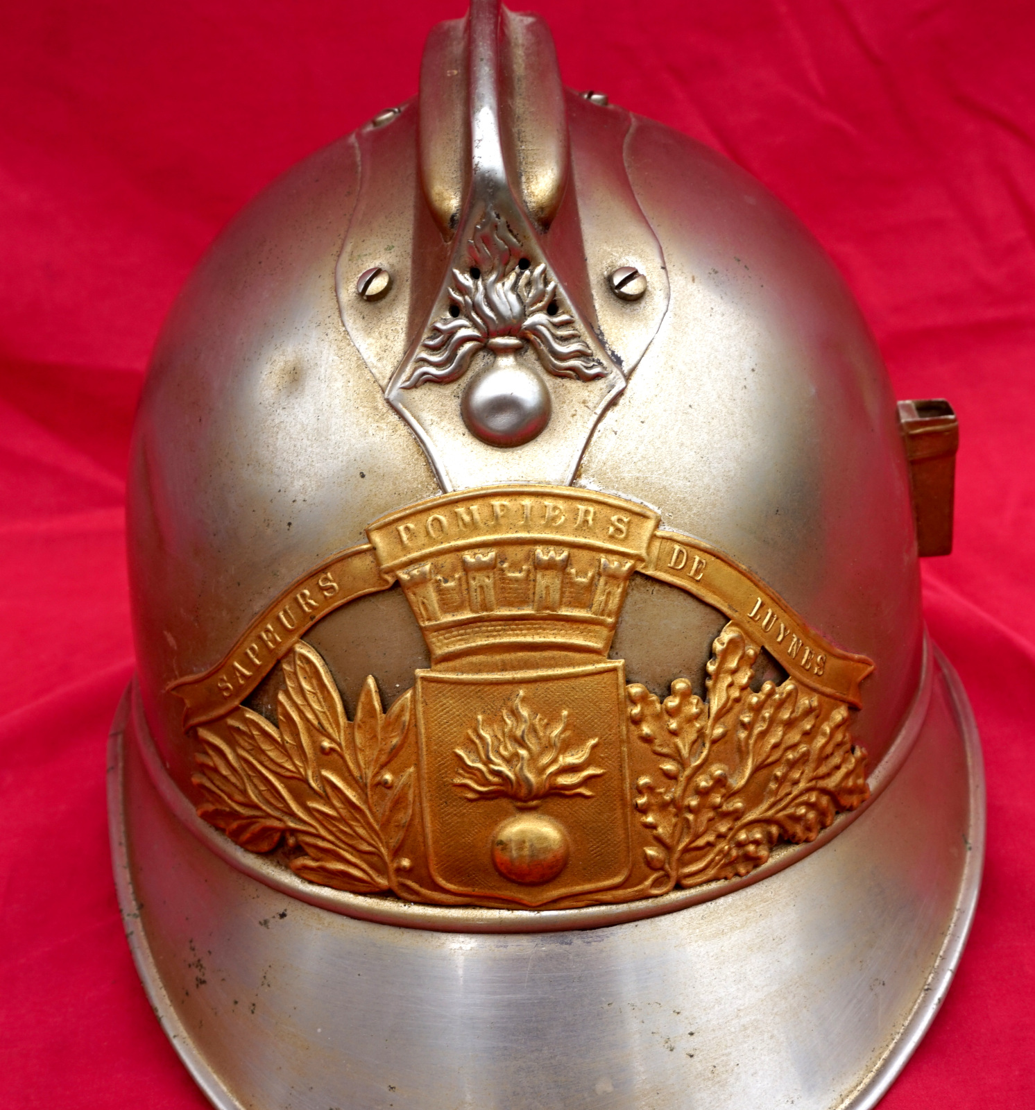 French nickeled metal fireman officer helmet model 1885 type Adrian with embossed brass plate: Sapeurs Pompiers de Luynes. It's complet with leather liner and leather chin strap (broken), inside hand written 5 1/2, as shown by the following pictures.