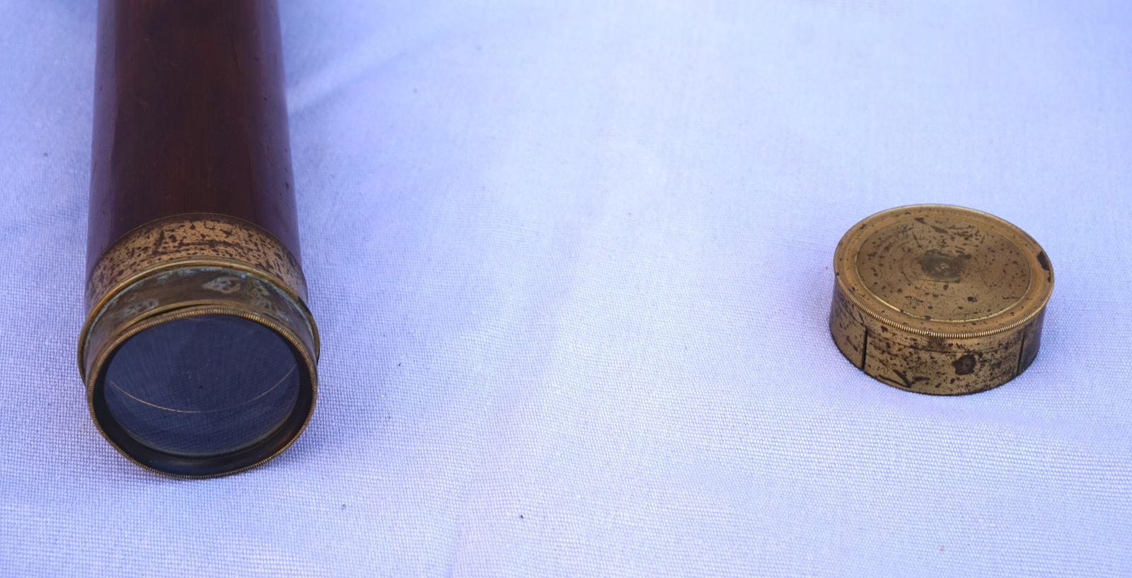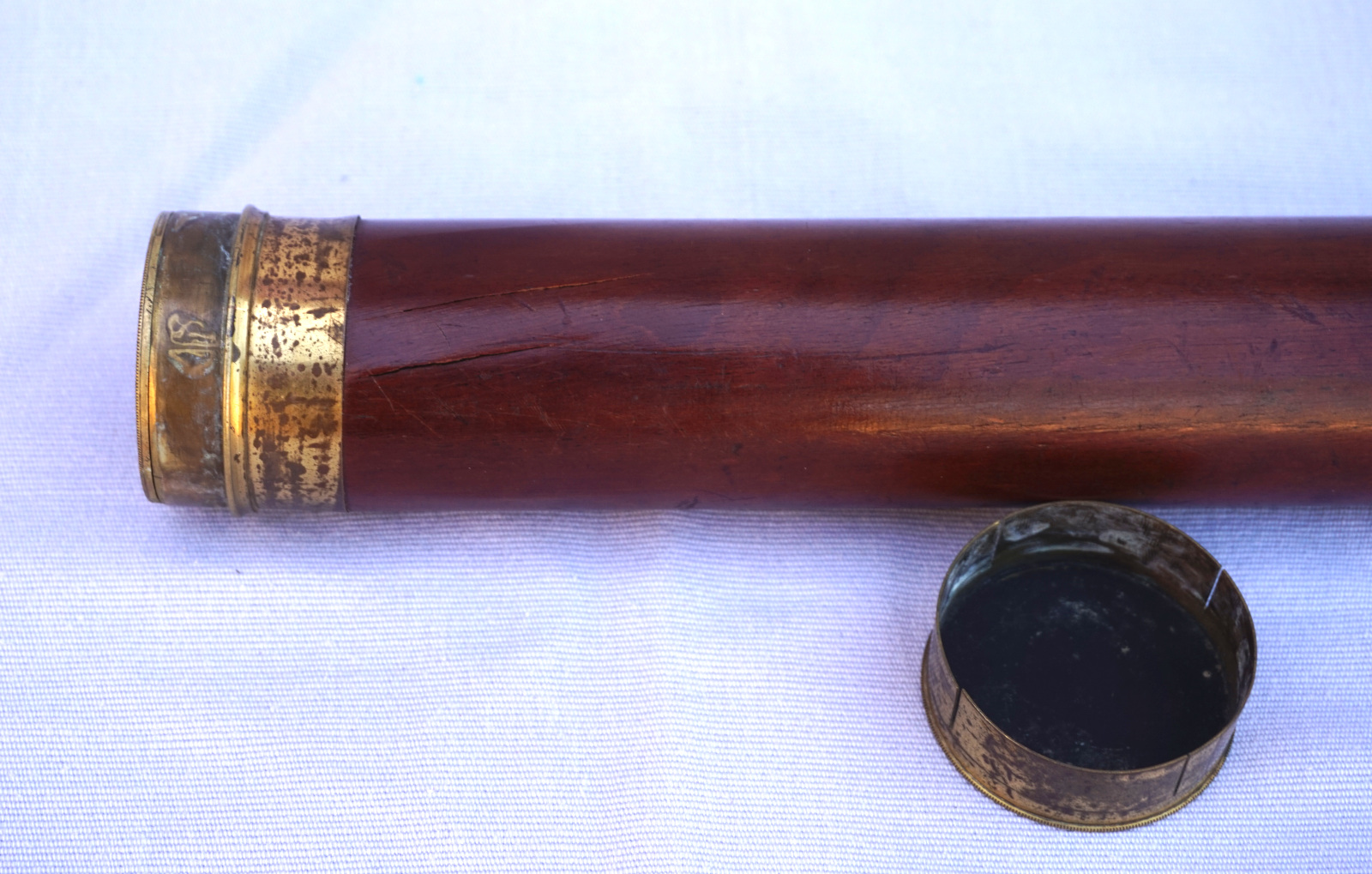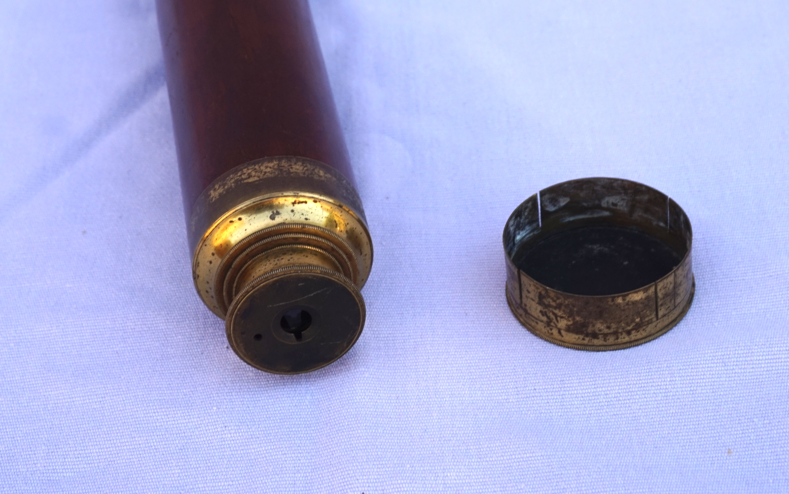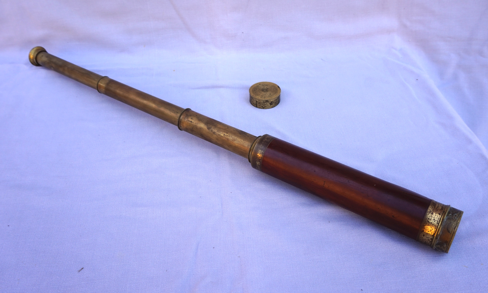 Longe vue repliable en laiton et fût en acajou, France fin XIX° siècle. Diamètre 5cm, longueur fermé 26.7cm, ouverte 71cm. Bel état, quelques micro fentes dans le fût de bois.