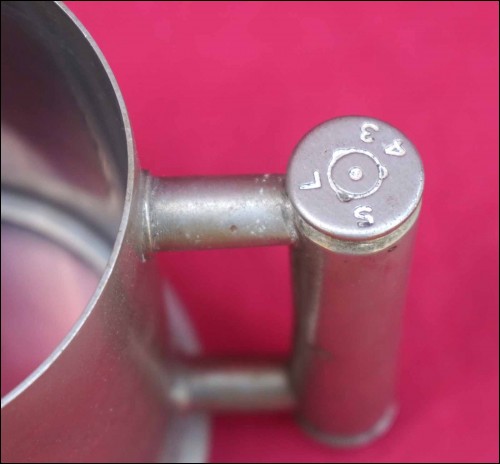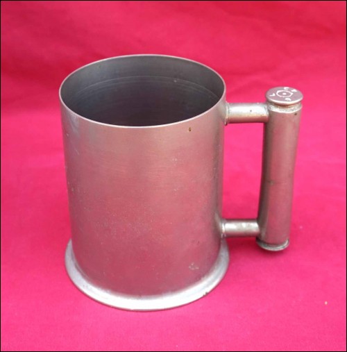 German Trench art work beer stein with glass bottom made with chromium shell in 1943. The shell on the handle are stamped SL 43. 5 3/8" (13.7cm) height, 3 7/8" (10cm) diameter, 5 3/8" (13.7cm) width with the handle. Good condition a few tiny stains on the handles as shown by the following pictures.