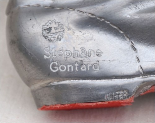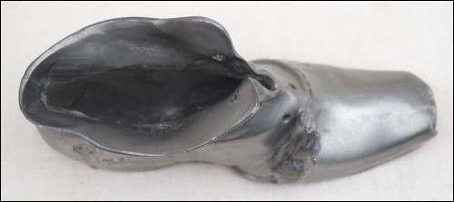 Bottine à la souris miniature en étain, publicité pour Stéphane Gontard créateur de chaussure depuis 1835, début XXème siècle. Bel état. Hauteur 6,5 cm, longueur 12 cm.