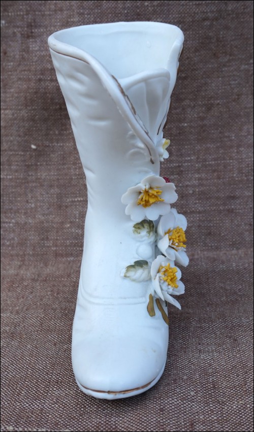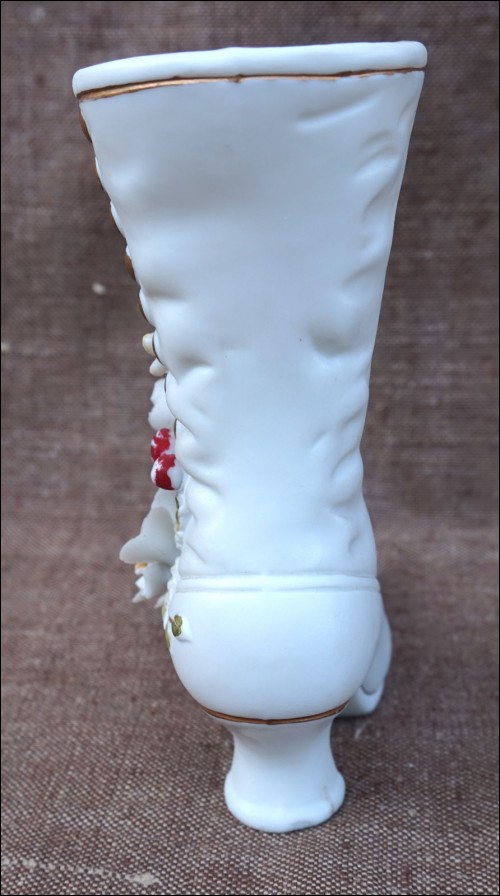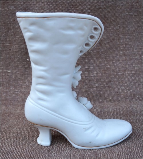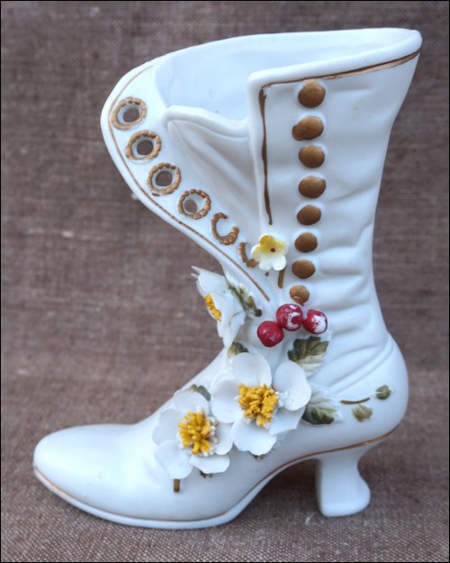 Chaussure bottine de dame en pâte de porcelaine Villenauxe, vers 1900. Elle est décorée de fleurs en relief et rehaut de dorure. Bel état, accident sur deux pétales. Hauteur 14,2 cm, longueur 13 cm.