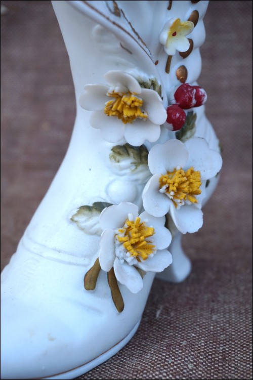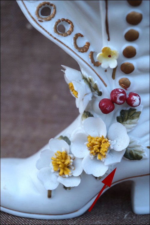 French hand painted and gilt bisque porcelain miniature shoe with flowers in relief made by Villenauxe during the 1900's. 5 5/8" height 5 1/8" length. Good condition only petals are slighty broken as presented on the following pictures.