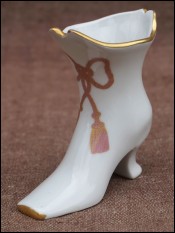 French hand painted and gilt porcelain miniature shoe showing cordon and pompoms made by Clerget in Limoges during the 1960's. 4 1/8" lenght 3 5/8" height. °Perfect condition as presented on the following pictures.