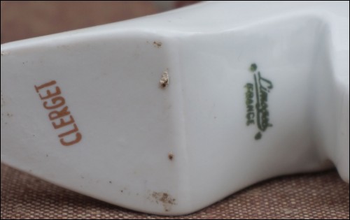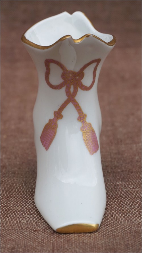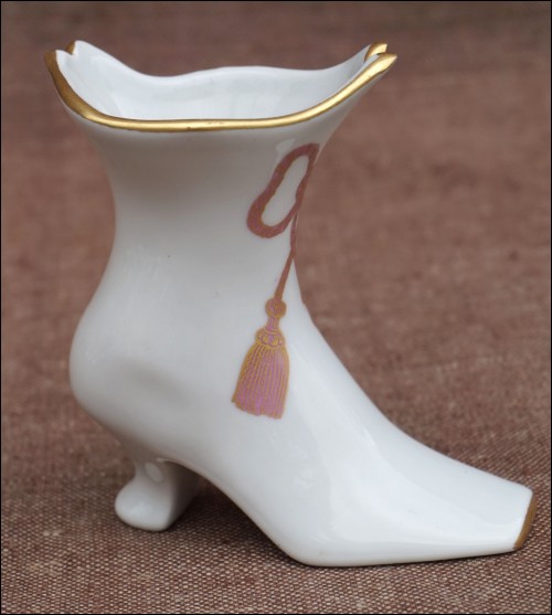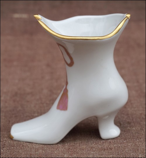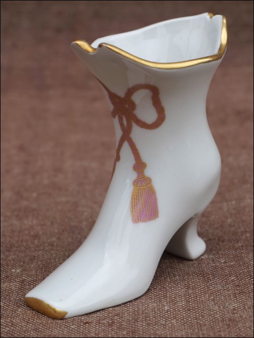 Bottine en porcelaine de Limoges, décoré main par Clerget et rehaussé d'or vers 1960.Longueur 10,4 cm, hauteur 9,3 cm. Parfait état.