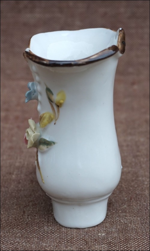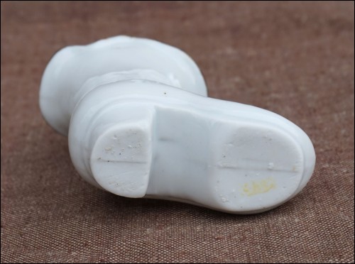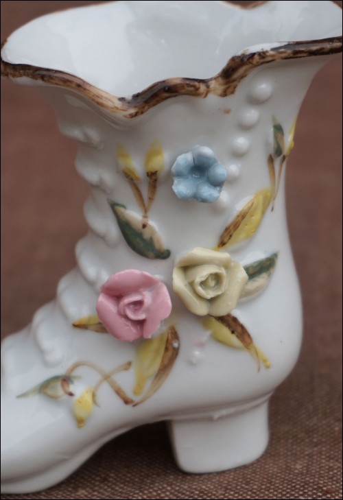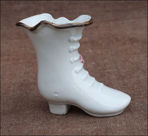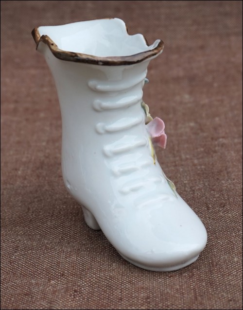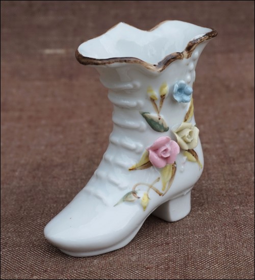 Chaussure de dame en porcelaine Villenauxe, vers 1920. Elle est décorée de fleur en relief. Bel état. Longueur 9 cm, hauteur 9,5 cm.
