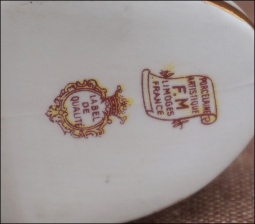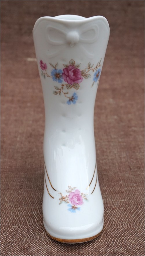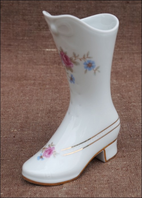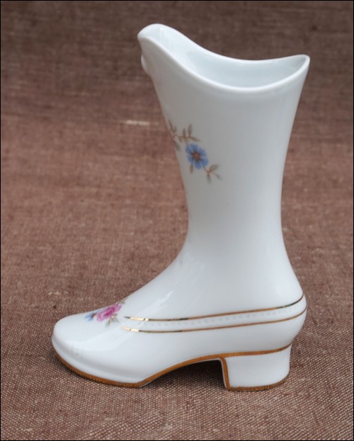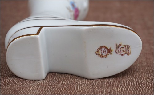 Bottine en porcelaine de Limoges, décor par transfert rehaussé d'or, porcelaine artistique FM, vers 1960. Longueur 10,2 cm, hauteur 14 cm. Parfait état.