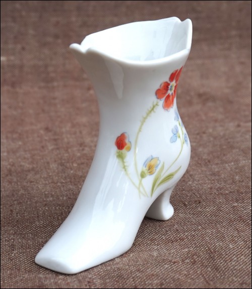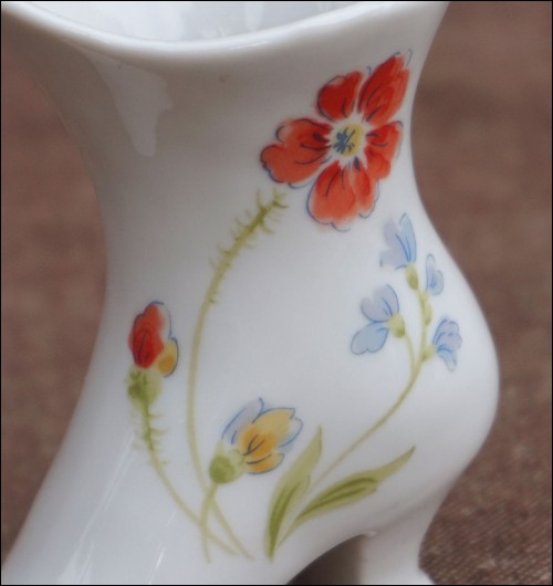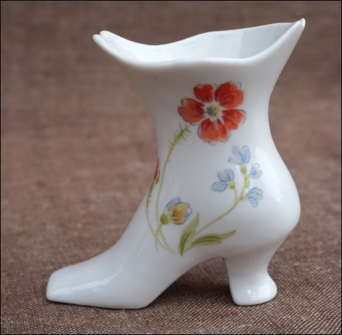 Vintage miniature shoe in transferware porcelain showing flowers and leaves made during the 80's.4 1/8" length 3 3/4" height. Perfect condition as presented on the following pictures.