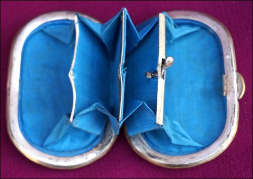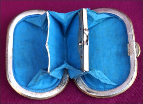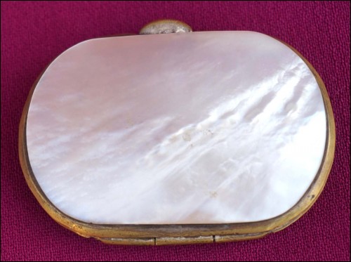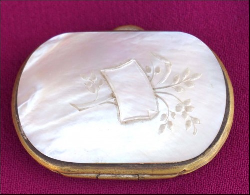 Porte monnaie de baptême en nacre sculpté ouvrant sur trois compartiments dont un refermable, vers 1860 Napoléon III. Longueur 6 cm, largeur 4,8 cm. Très bel état, il ouvre et ferme parfaitement.