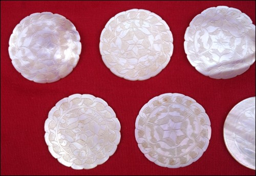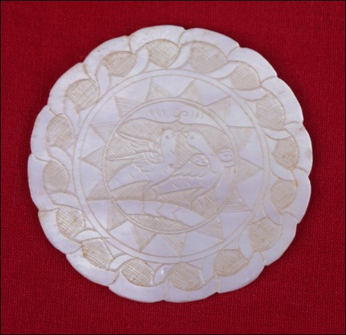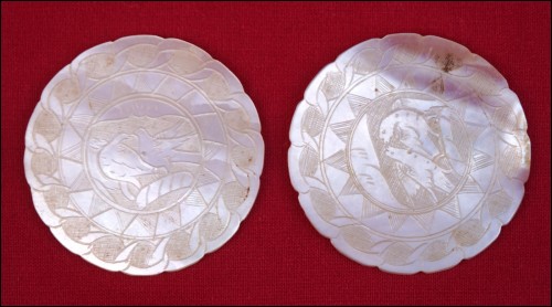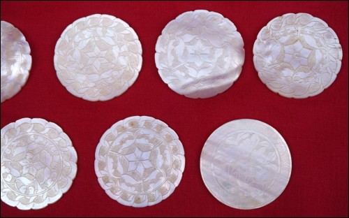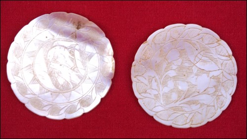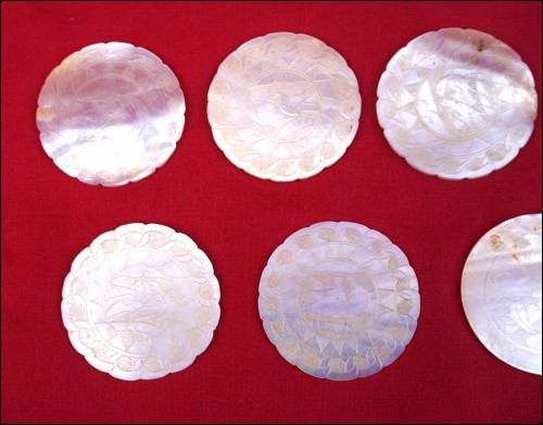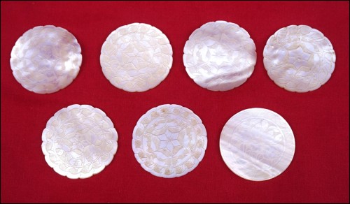 Antique french engraved mother of pearl set of 7 token made during the 18th century. 1 1/4" (3.25cm) diameter. Beautiful condition a few small stains as shown by the following pictures.