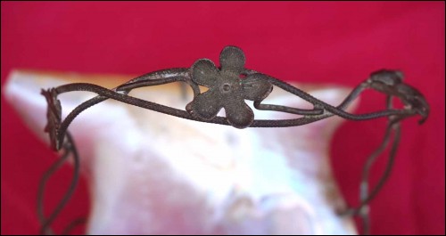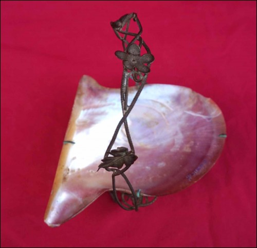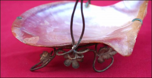 Vide poche coquillage à monture en laiton orné de fleurettes, début XXe siècle. Bel état. Largeur 15 cm, hauteur 13.5 cm. Bel état.