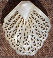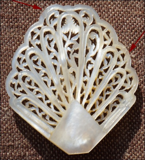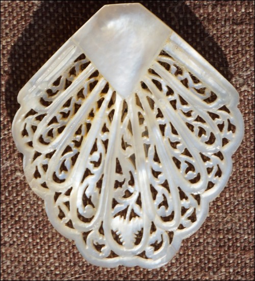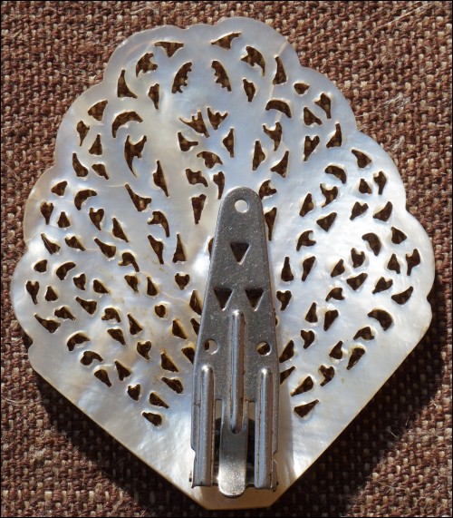 Broche de col en nacre sculptée en roue de paon, vers 1950. Bel état, un petit éclat et une grenure avec un fêle. Hauteur 5,5 cm, largeur 4,8 cm.