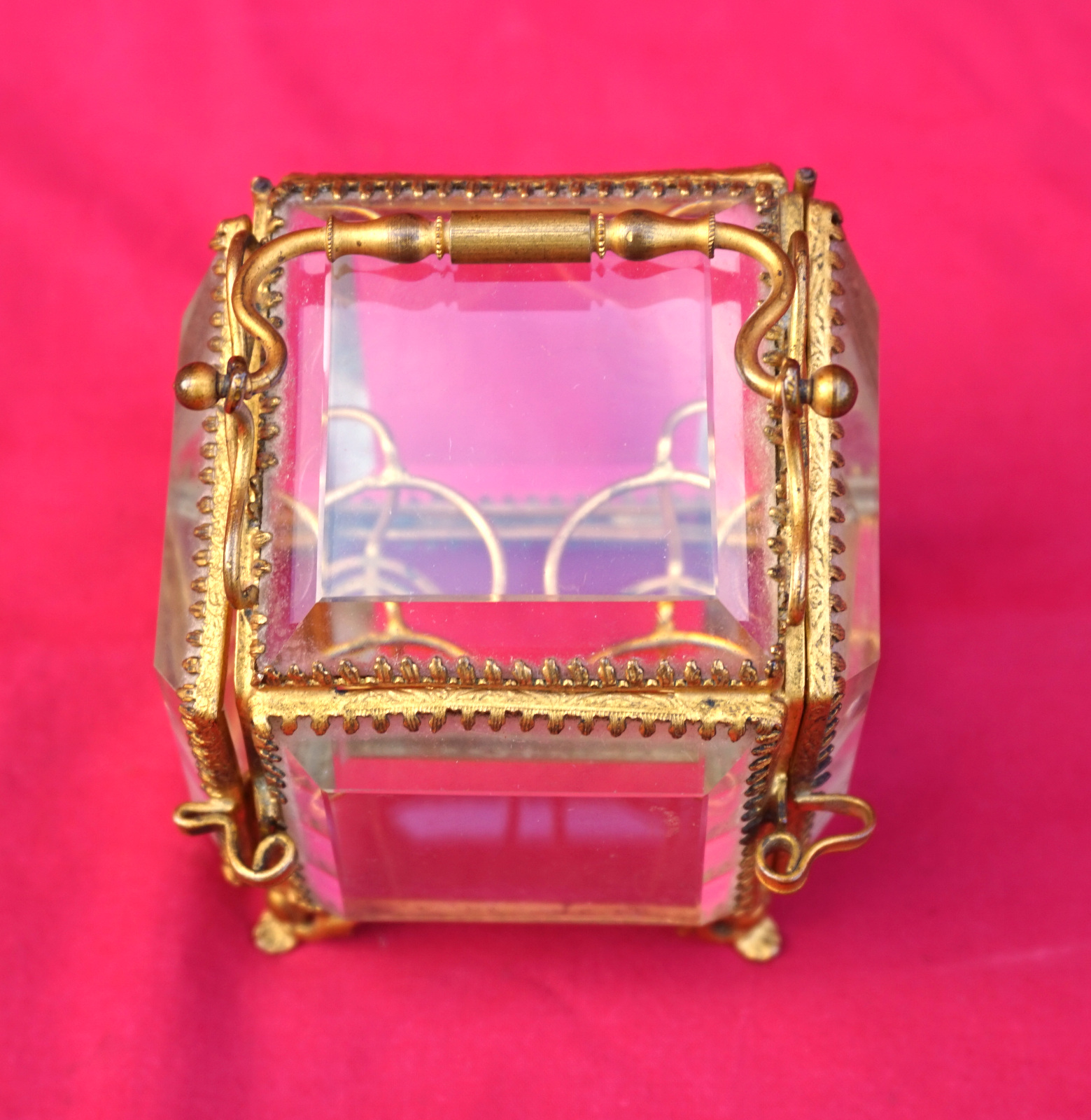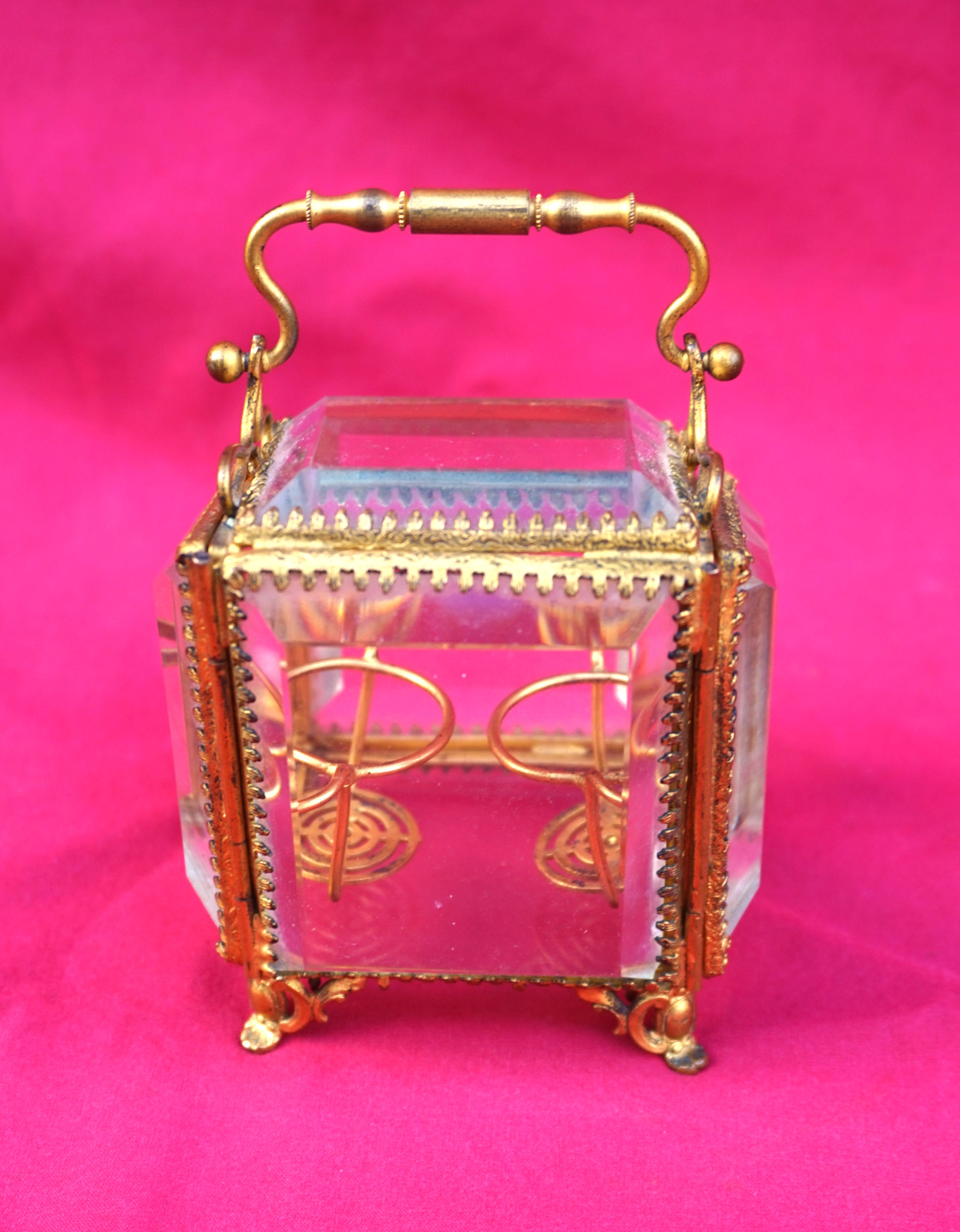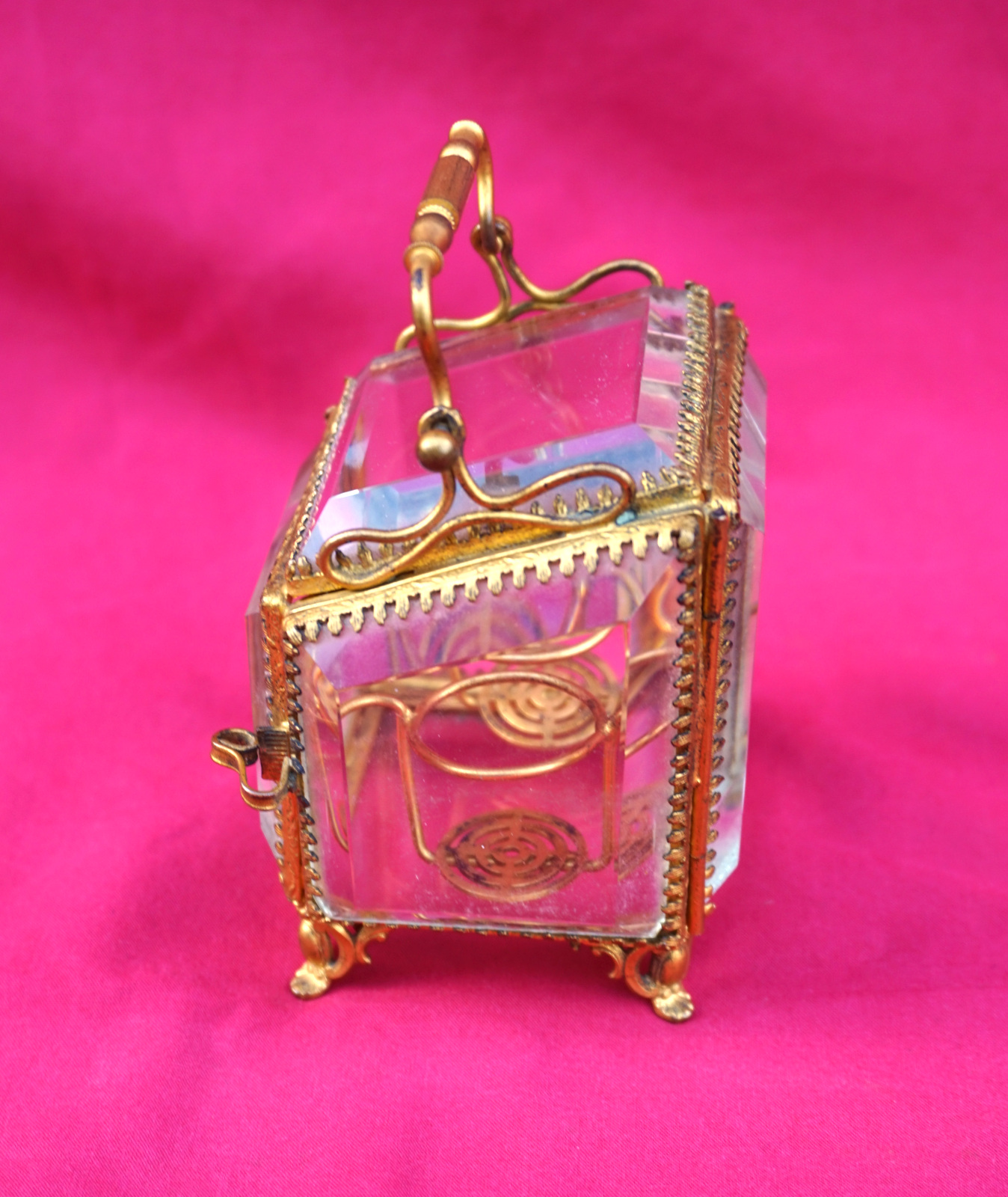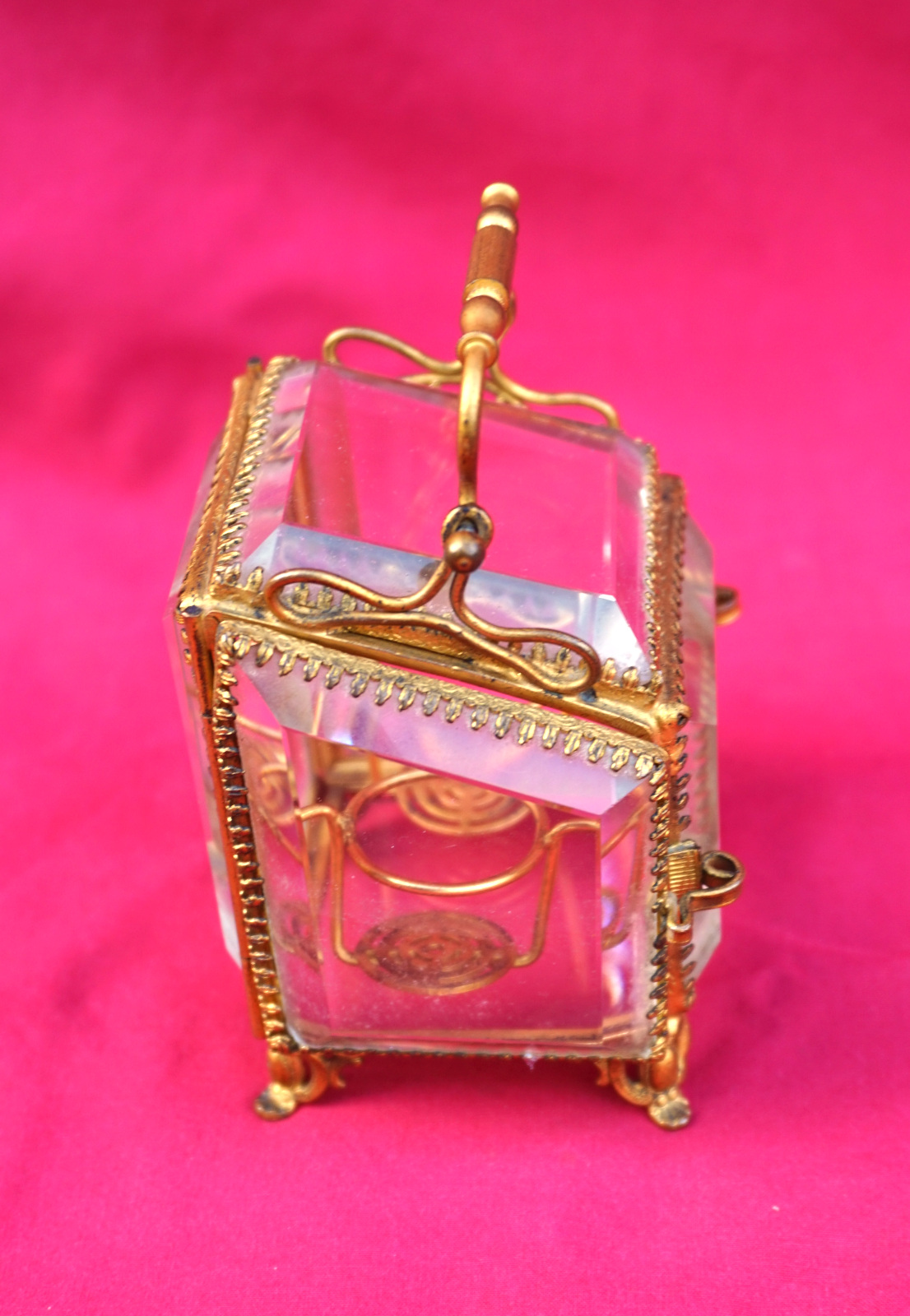 Boite à flacon de senteurs en glaces biseautée et monture laiton doré, fin XIX° siècle. Hauteur 8 cm sans l'anse, largeur 7 cm, profodeur 6.2 cm. Parfait état.