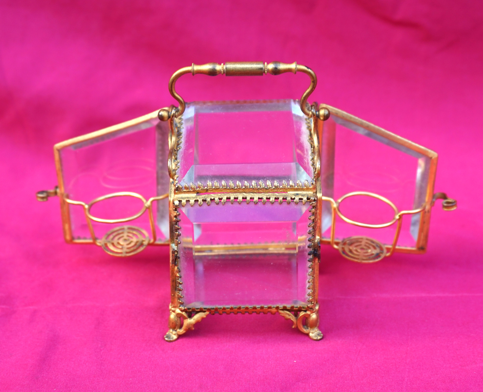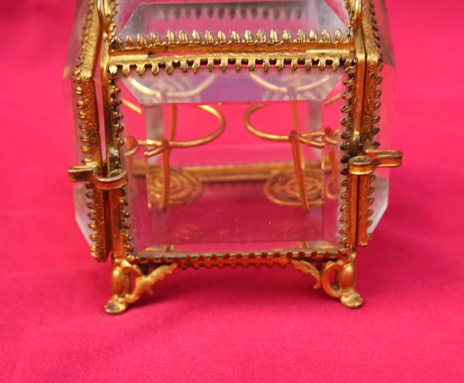 Antique french jewelry with 2 perfume bottle stands box trinket with bevelled glasses and ormolu with silk cushion inside made in Paris late 19th century. 3 1/8" (8cm) height, 2 3/4" (7cm) width, 2 3/8" (6.2cm) depth. Perfect condition the perfume bottles are missing.