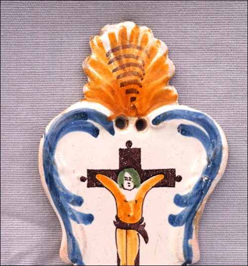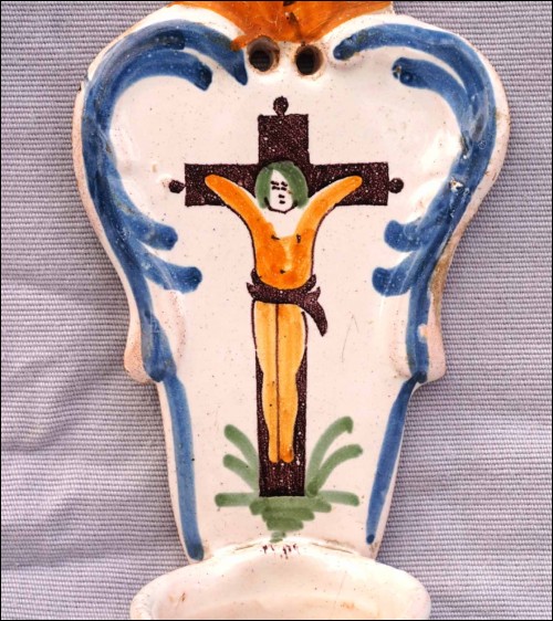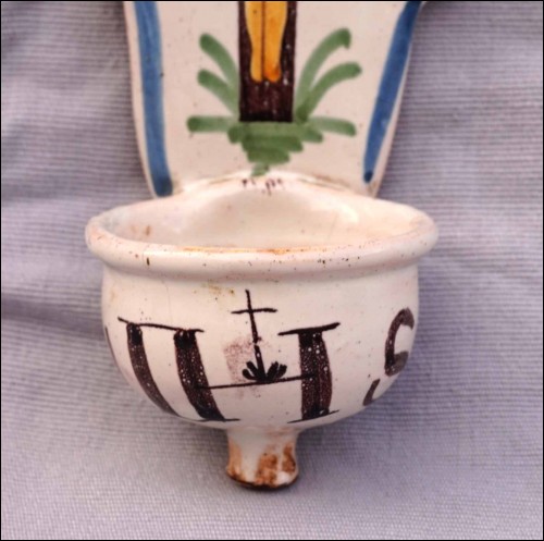 Antique french hand painted faience wall crucifix with holy water font made in Nevers during the middle of the 18th century. 8 1/2" (21.5cm) height, 3 3/4" (9.5cm) width. Beautiful condition, no chips or cracks and 2 holes for hanging as shown by the following pictures.