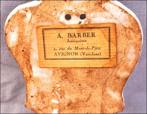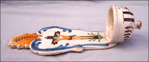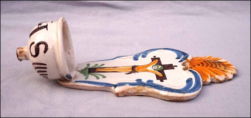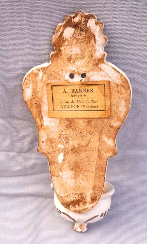 Bénitier en faïence de Nevers, milieu XVIII° siècle. Il porte une étiquette d'antiquaire au dos. Hauteur 21.5 cm, largeur 9.5 cm. Très bel état.