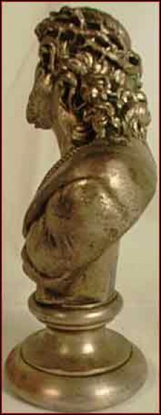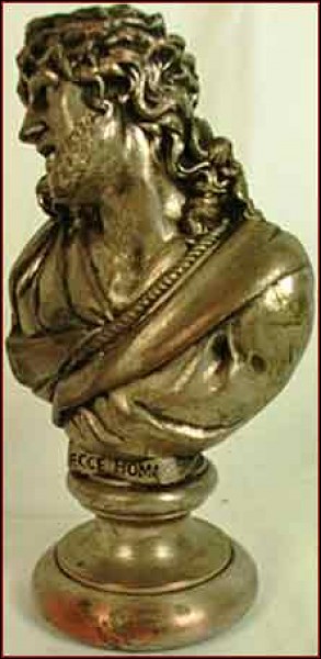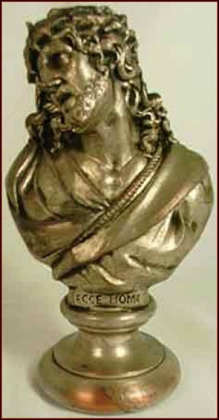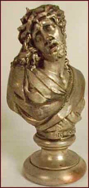 Le Christ en buste: la grandeur dans la souffrance, par le sculpteur Hardy, en galvanoplastie, née vers 1900. Cette sculpture s'appelle "Ecce Homo" de l'évangile selon saint Jean, au moment où le Christ comparaît devant Ponce Pilate: "Jésus sortit portant la couronne d'épines et le manteau de pourpre et Pilate dit à la foule: Voilà l'homme". Bon état, quelques usures d'argenture. Hauteur 16 cm.