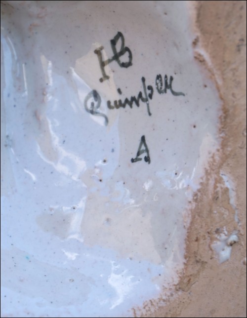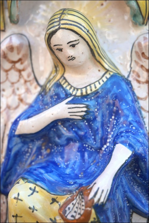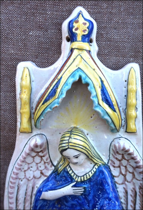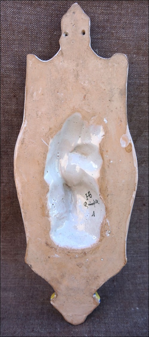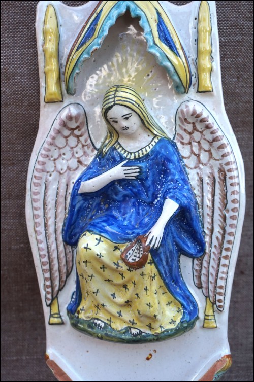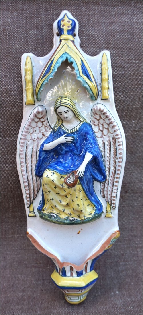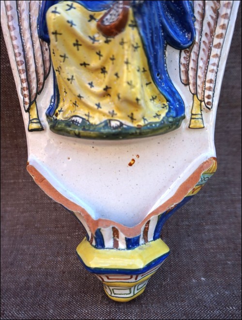 Large holy water font with angel below a canopy made by HB in Quimper during the 1930's. It's signed on the back with the mark of the painter and HB Quimper. 13 3/8" height 5 1/8" width. Unfortunately the font was broken and missing as presented on the following pictures.