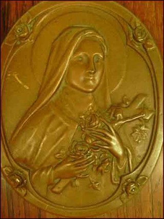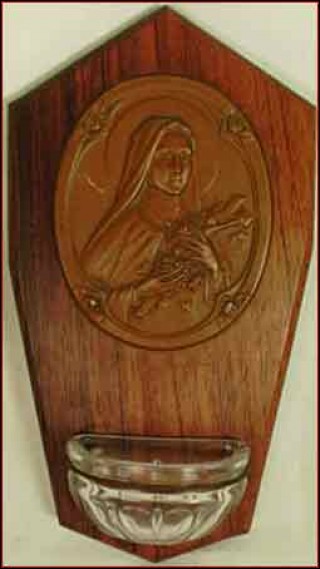 This holy water font in rosewood and brass has been made around 1930. The oval bras medallion depicts Ste Therese of Lisieux holding crucifix and bunch of roses. Good condition a small scratch on the medallion like you can see on the picture below. 7"1/2 tall 4" width.