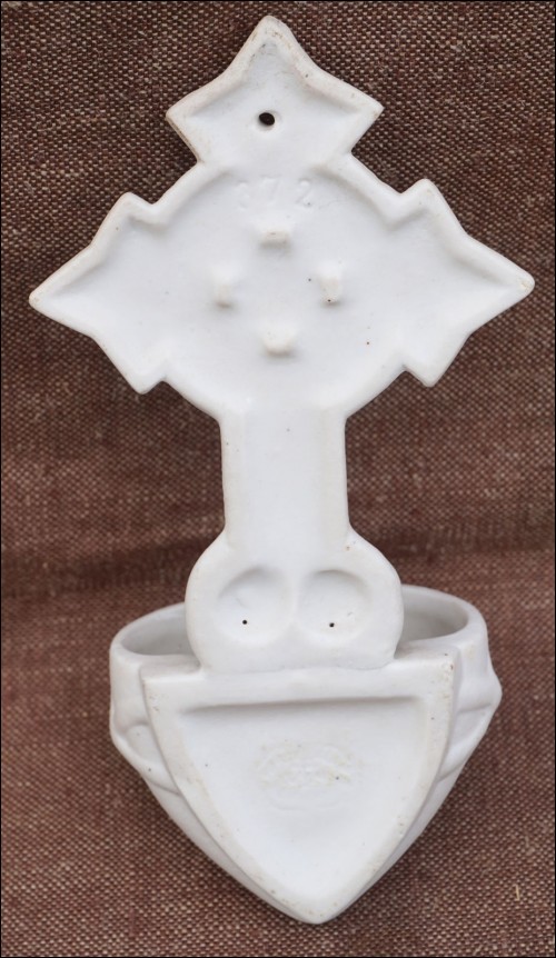 Holy water font showing a Gothic Cross and the Crown of Thorns in porcelain biscuit made by Mauger Fils & Pezé in Villenauxe near Paris during the end of the 19th century. It's signed on the back. 6 7/8" height 3 1/2" width. Perfect condition as presented on the following pictures.