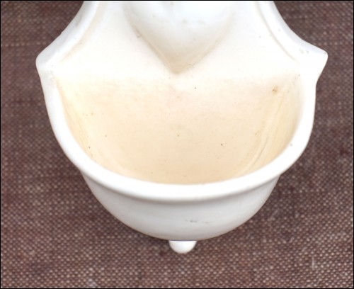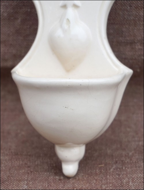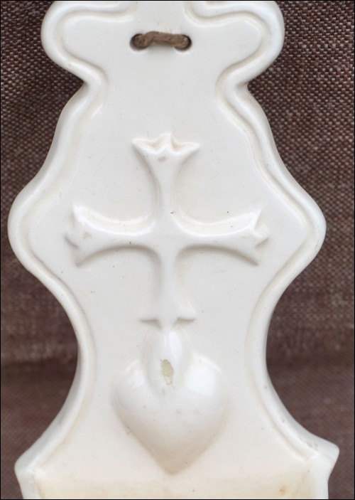 French Holy Water Font showing the Sacred heart and the Holy Cross in glazed clay made during the 1900's. 7 7/8" height 3 1/8" width. Perfect condition as presented on the following pictures.