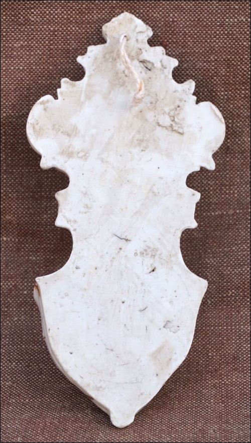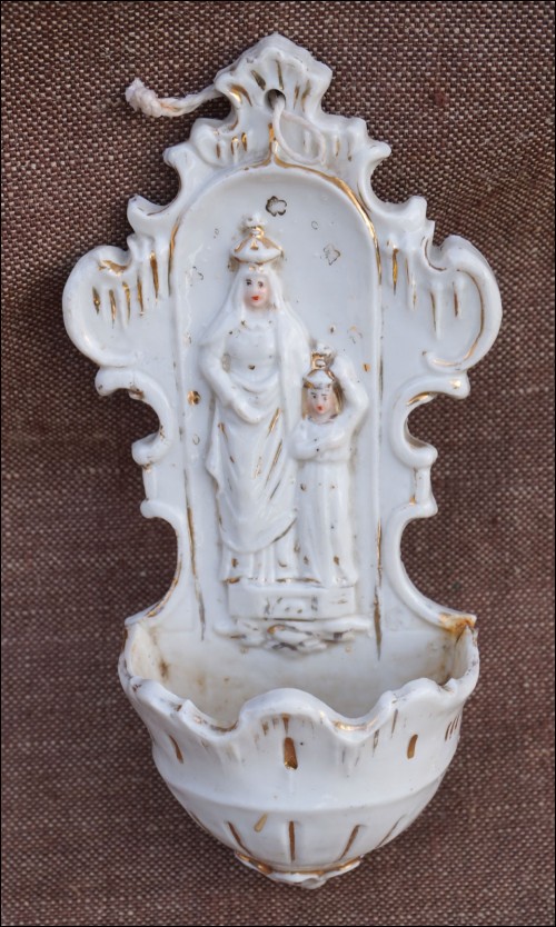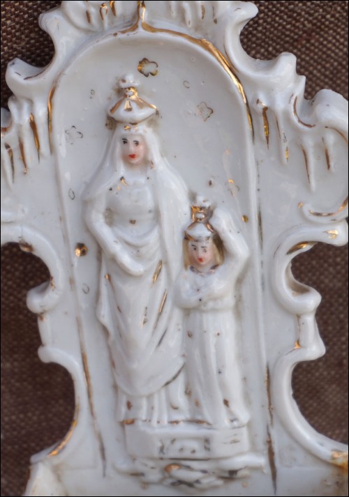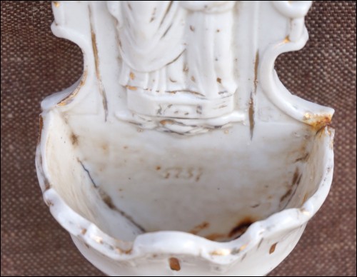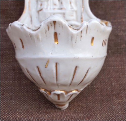 Bénitier de chevet en porcelaine de Paris, Sainte Anne et sa fille Marie, souvenir du couronnement de 1868, deuxième moitié du XIXème siècle. Il est rehaussé à L'or 18 ct. Bel état, moule n° 5237. Hauteur 17 cm, largeur 8,3 cm, épaisseur 4,8 cm.
