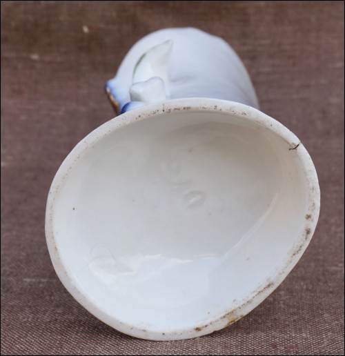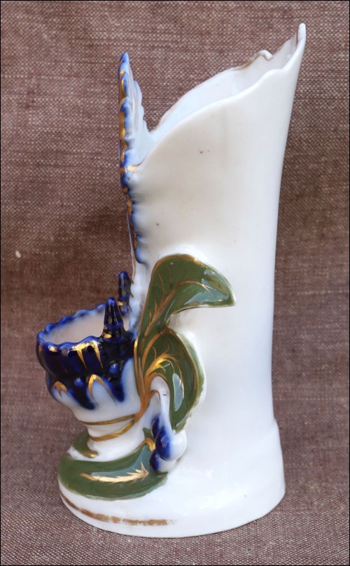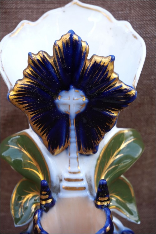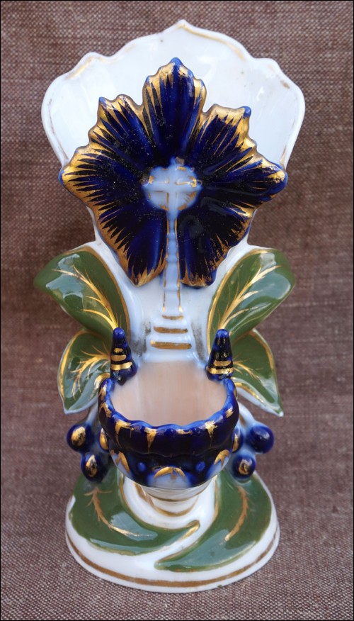 French holy water font with vase in gilt and enameled porcelain made by Valentine during the 1850's Louis Philippe period. It's signed and numbered on the bottom. 7 1/2" height 4 " width 4" depth. Perfect condition as presented on the following pictures.