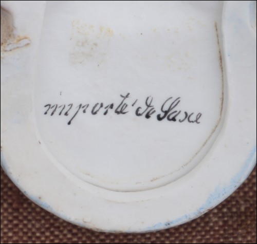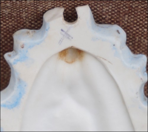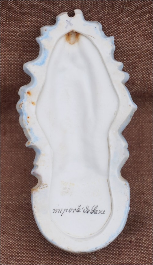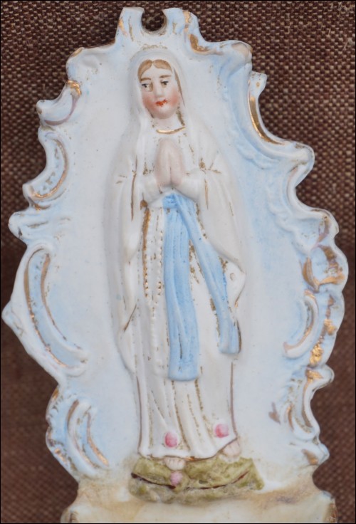 Holy water font showing Our Lady of Lourdes in hand painted porcelain biscuit made in Saxe during the 1900's. It's signed on the back. 5 1/2" height 2 3/4" width 1 3/4" depth. A damage on the top of the hole for hanging as presented on the following pictures.