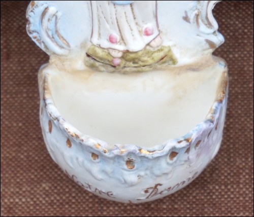 Bénitier mural en biscuit importé de Saxe peint à la main, Notre Dame de l'Immaculée conception, souvenir de Lourdes, début du XXème siècle. Il est signé importé de Saxe. Dans l'état, accident en haut. Hauteur 14 cm, largeur 7 cm, profondeur 4,5 cm.