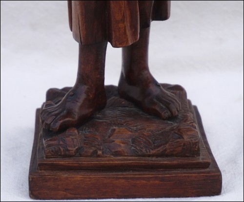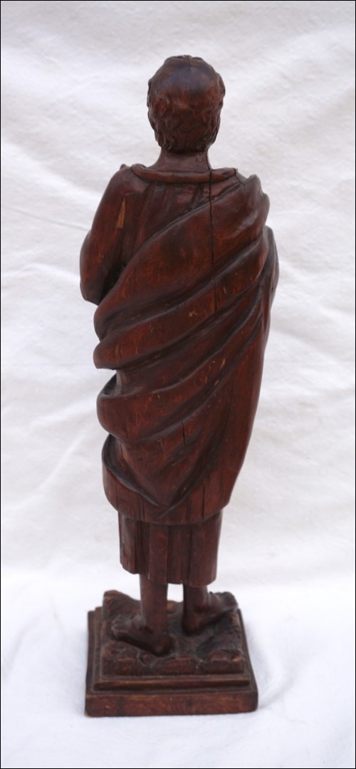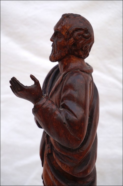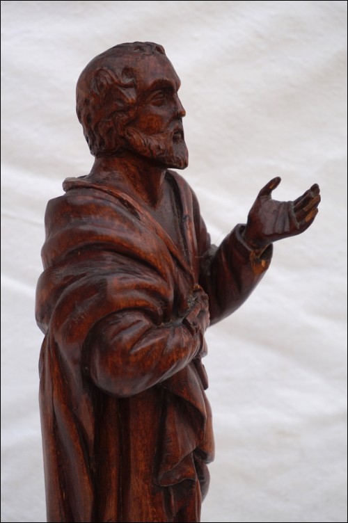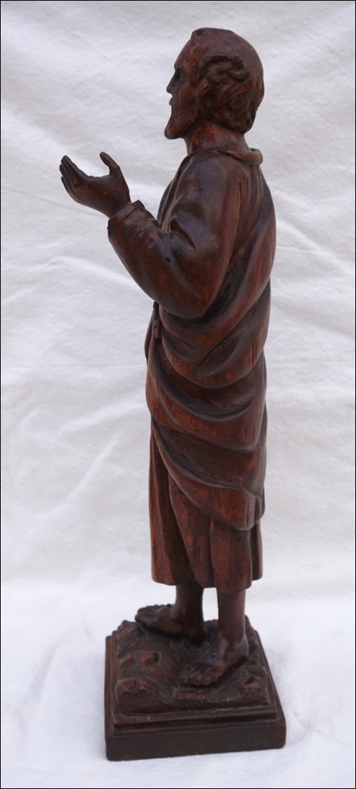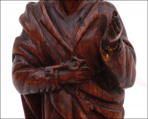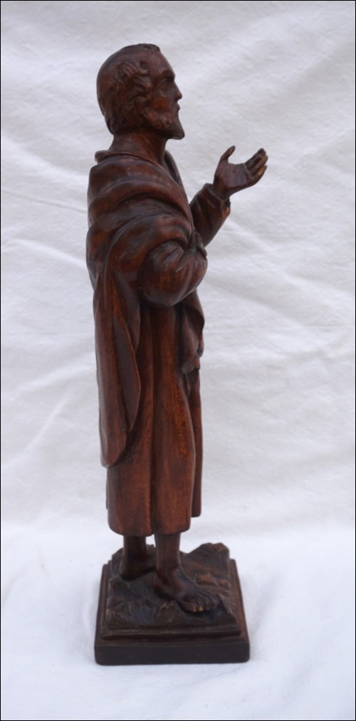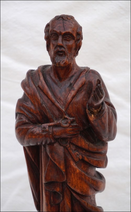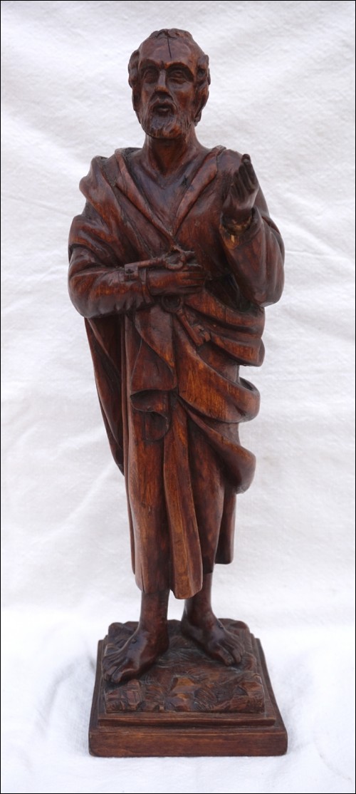 Saint Pierre french hand carved wood statue figure made during the second half of the 19th century. 13 3/4" (35cm) height, for the base 3 7/8" (10cm) width, 3 3/4" (9.5cm) depth, weight 1lb 7.21oz (658grams). Good condition, tiny chip inside the right handle, with beautiful patina as shown by the following pictures.