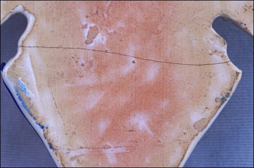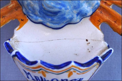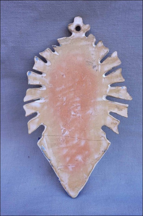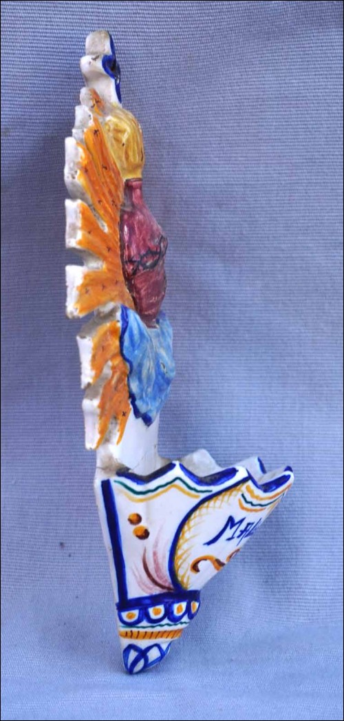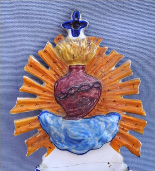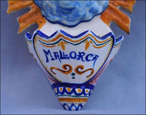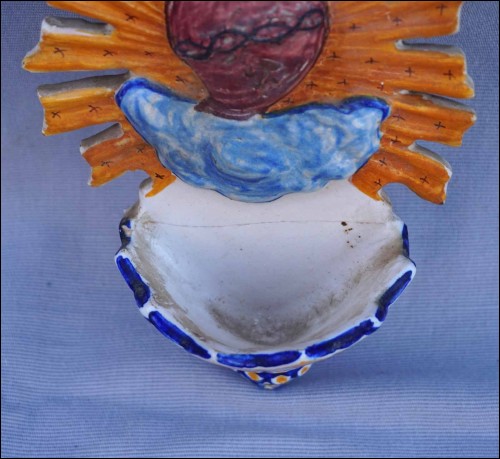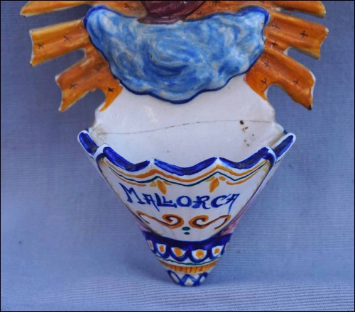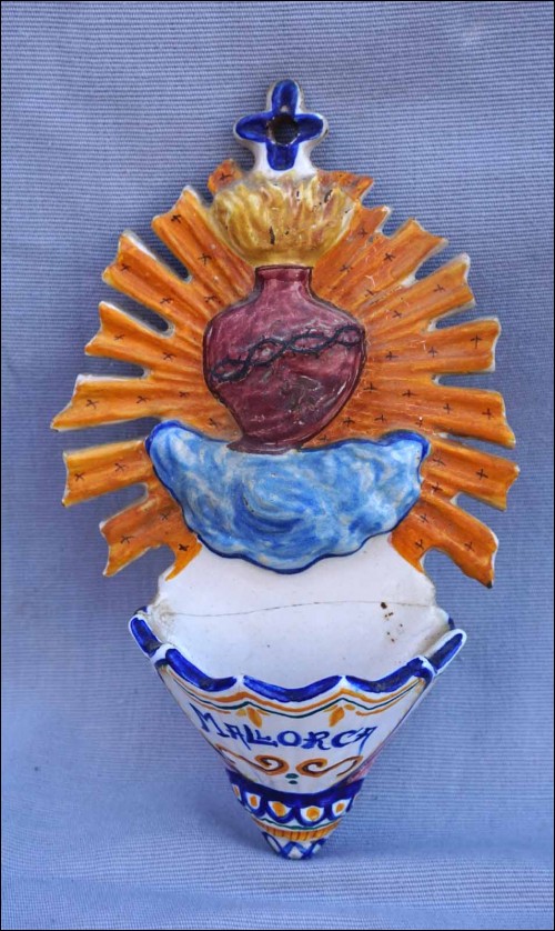 Spain hand painted faience holy water font showing the Sacred Heart for Mallorca. 8" (20.5cm) height, 4 3/4" (12cm) width, 2 3/8" (6cm) depth. Glued in the middle as shown by the following pictures.