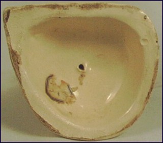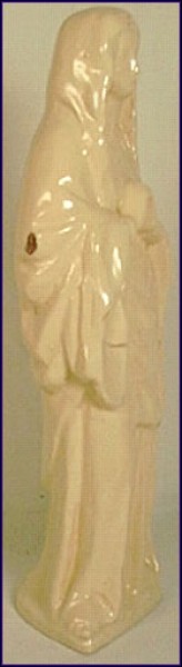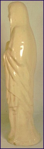 Vierge en majolique monochrome de la région de Quimper, plus précisément Rennes. La jeune Vierge Marie prie les doigts croisés. Elle est en bon état malgré une larme sur son côté droit et une grenure au pied gauche de la statue. Sur son fond une vielle étiquette de prix date ce travail vers 1930. Hauteur 28.5cm.