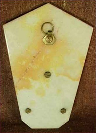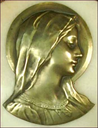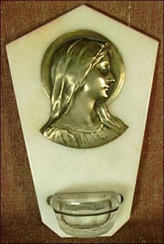 Bénitier en verre moulé sur un fond d'onyx du Maroc, vers 1940. Au dessus du bénitier, la Vierge Marie vue de profil en tôle de laiton. Hauteur 20cm.