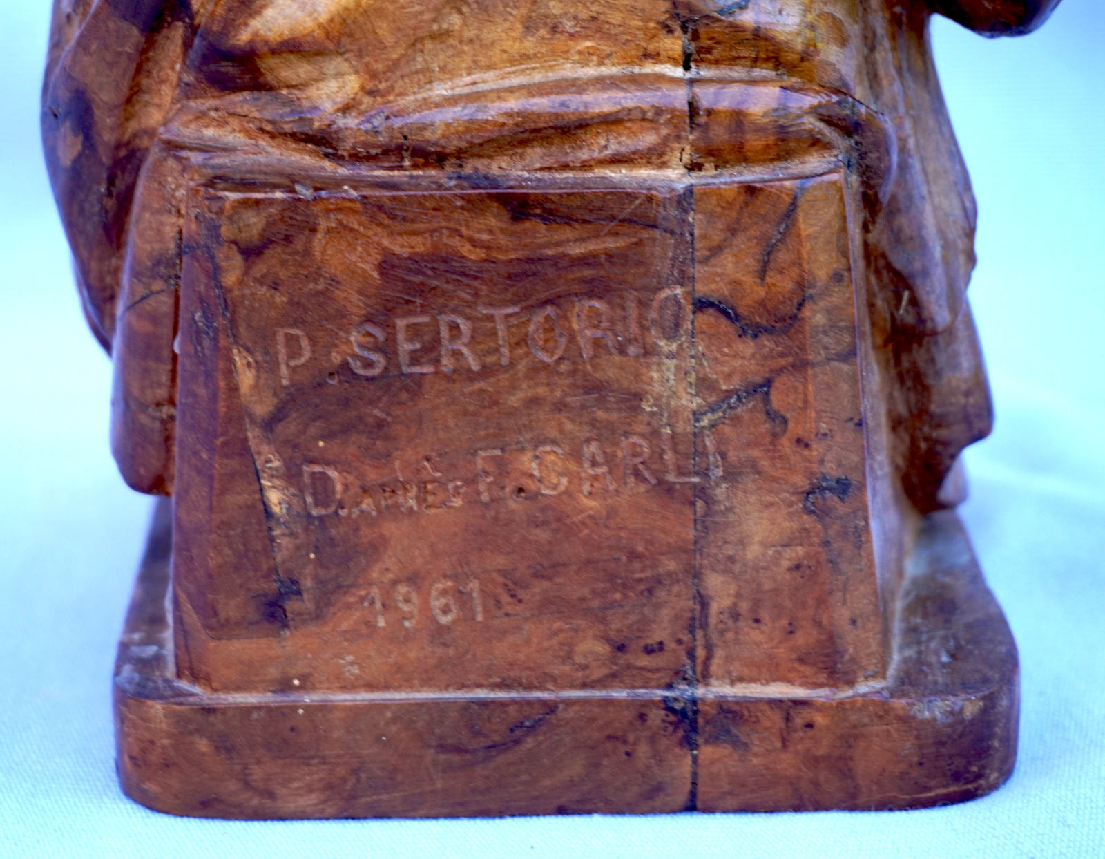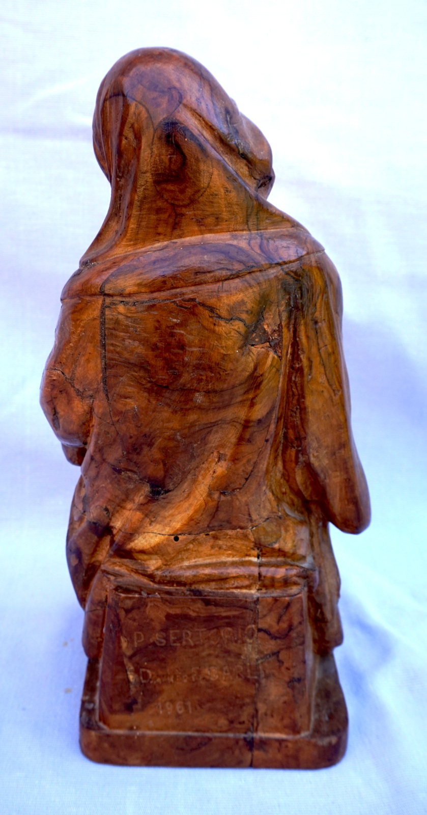 Vierge de lait à l'enfant Jésus en bois d'olivier sculpté par P Sertorio d'après François Carli, sculpteur d'art religieux à Marseille, daté 1961. HAuteur 26 cm, largeur 10.5 cm, profondeur 11.5 cm. Parfait état.