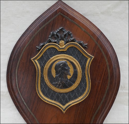 Bénitier mural en palissandre massif à filet de laiton, en médaillon, le Christ de profil en galvanoplastie signé J Doisy (Doisy C.J.V), vers 1920. Bel état d'usage. Hauteur 35 cm, largeur 21 cm.