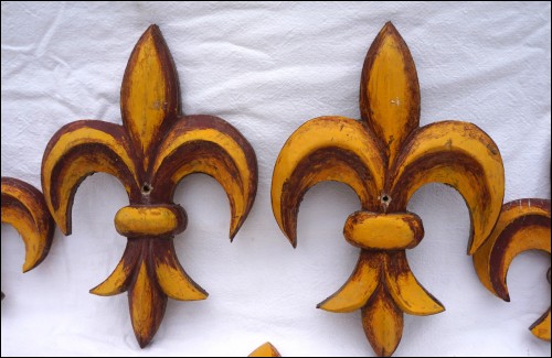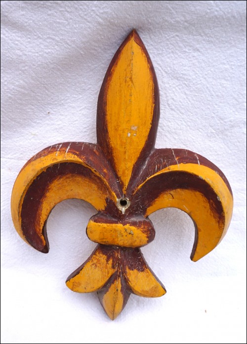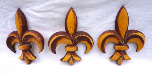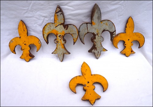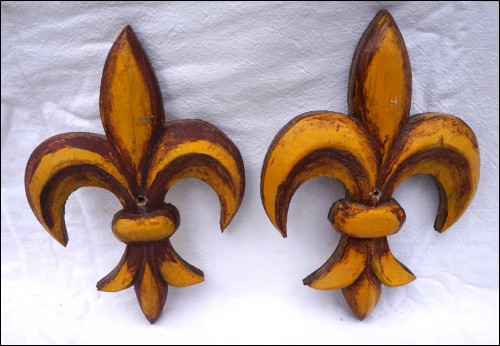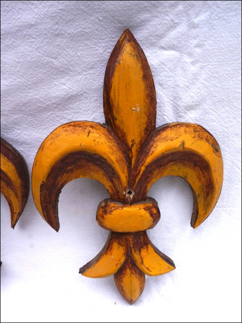 Cinq fleurs de Lys, deux grandes et 3 moyennes, en bois sculpté peint. Dimensions: pour les plus grandes hauteur 30cm, largeur 20cm, les plus petites hauteur 22.7cm, largeur 17.5cm. Très bel état.