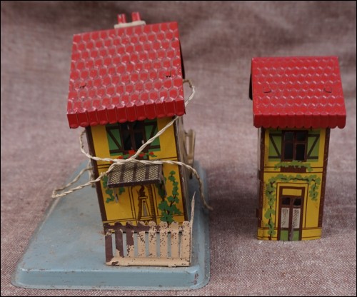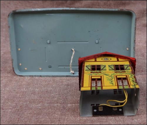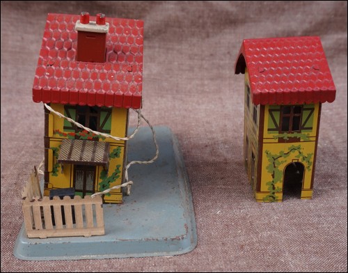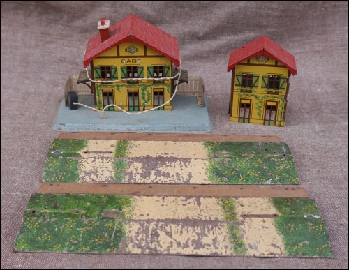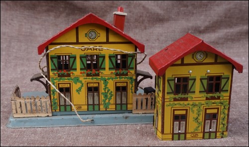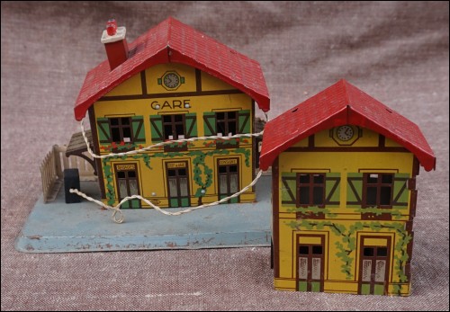 French railways train station with annex station and 2 platforms in original painted tole, O gauge, made by JEP 1936-1966. The both stations have 1 light and their original paintings. Good condition. 4 1/2" height for each buildings.