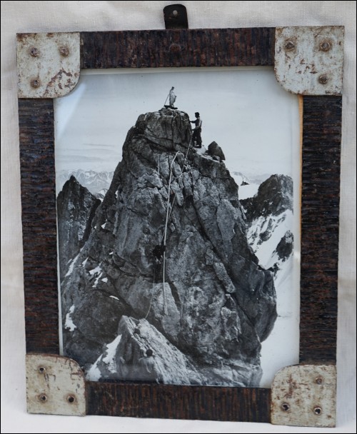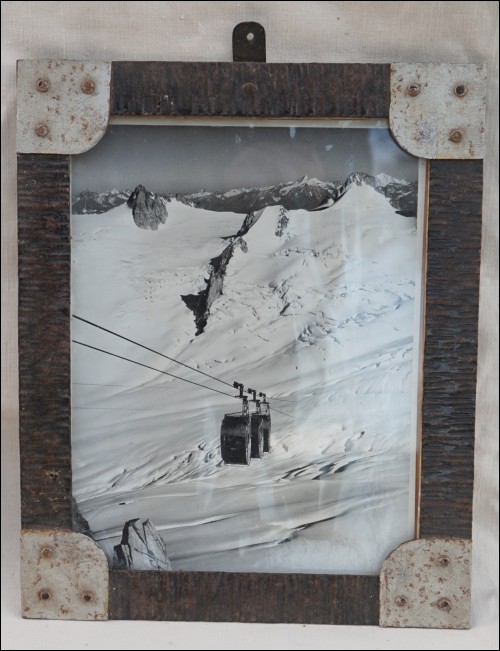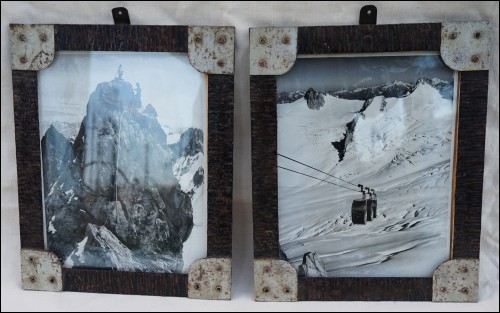 Pendant de deux photographies argentique de Chamonix, l?ascension de la Dent du Géant et le télécabine de la vallée blanche (plus tard télécabine panoramique Mont Blanc), dans leur cadre d'origine, années 50's. Photos 23 cm X 17,5 cm; Cadres métalliques 28 cm X 23 cm.