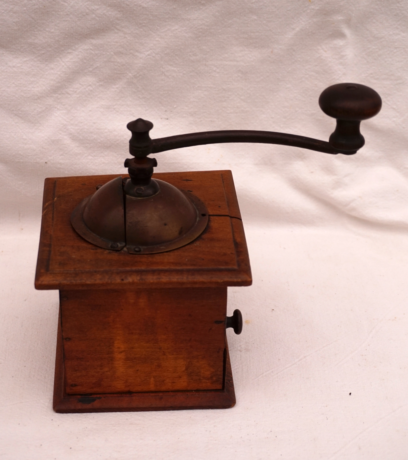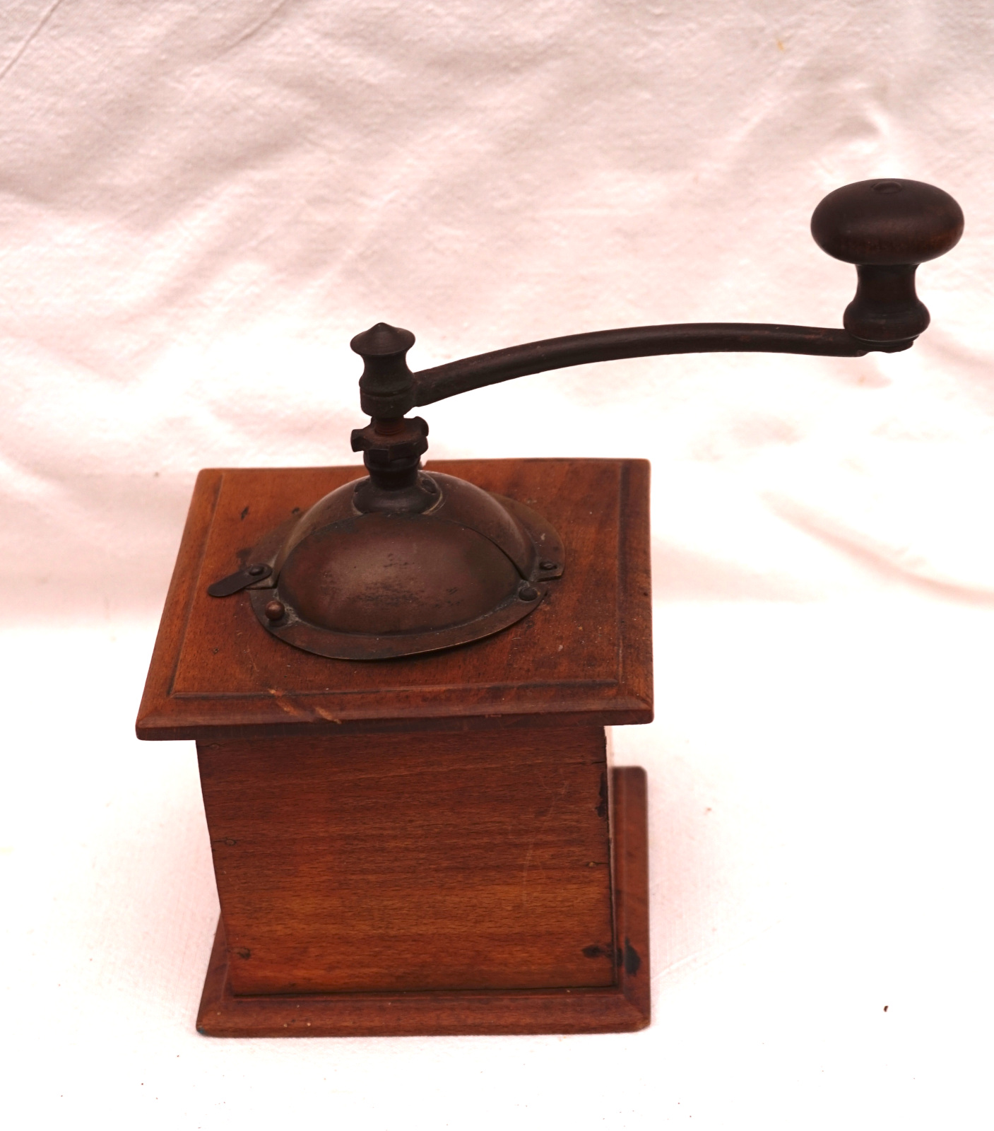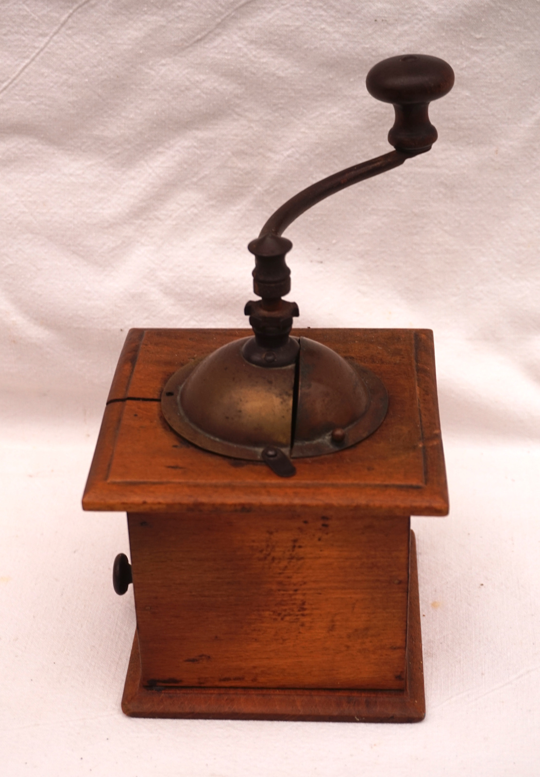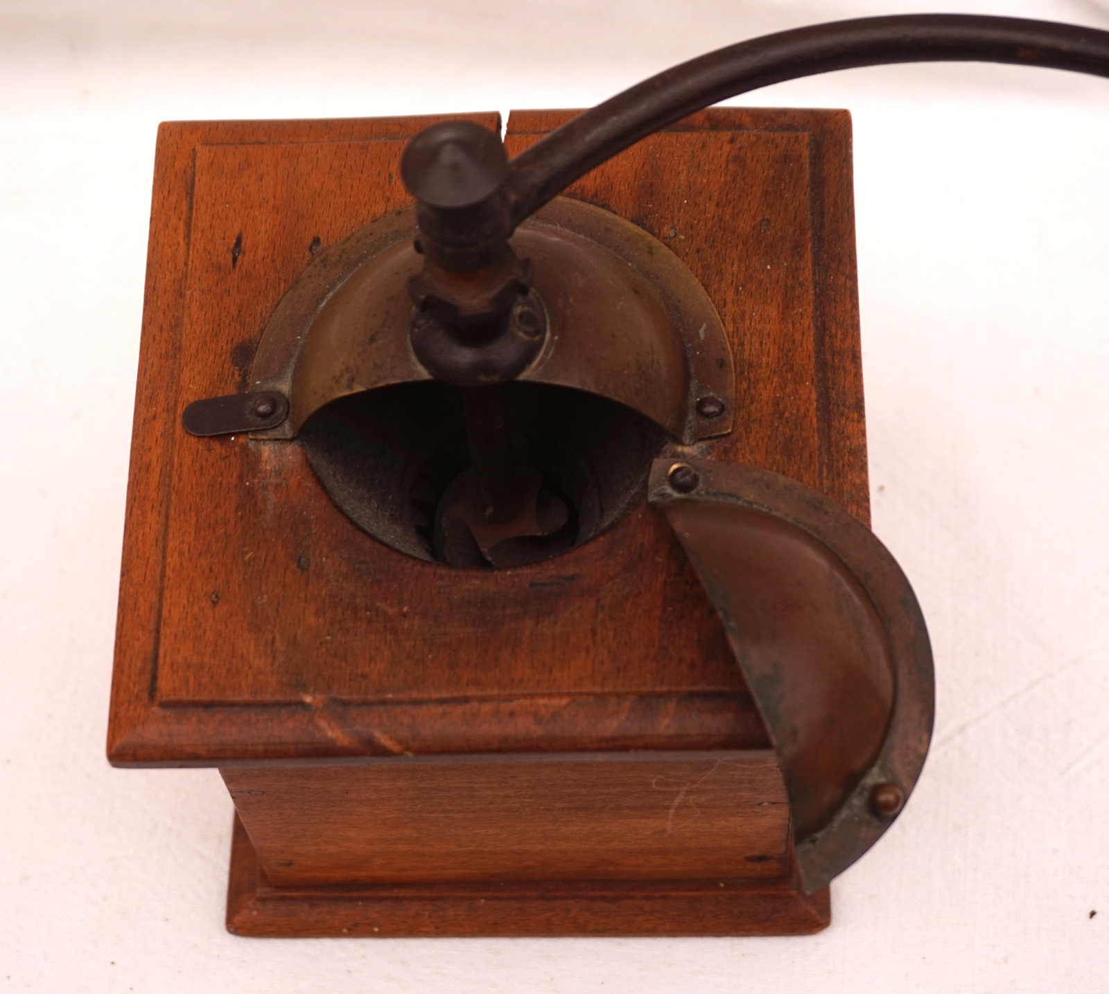 Moulin à café Peugeot, modèle S, couvercle laiton vers 1900. Hauteur 19.2 cm, par coté 12.5 cm. En état.