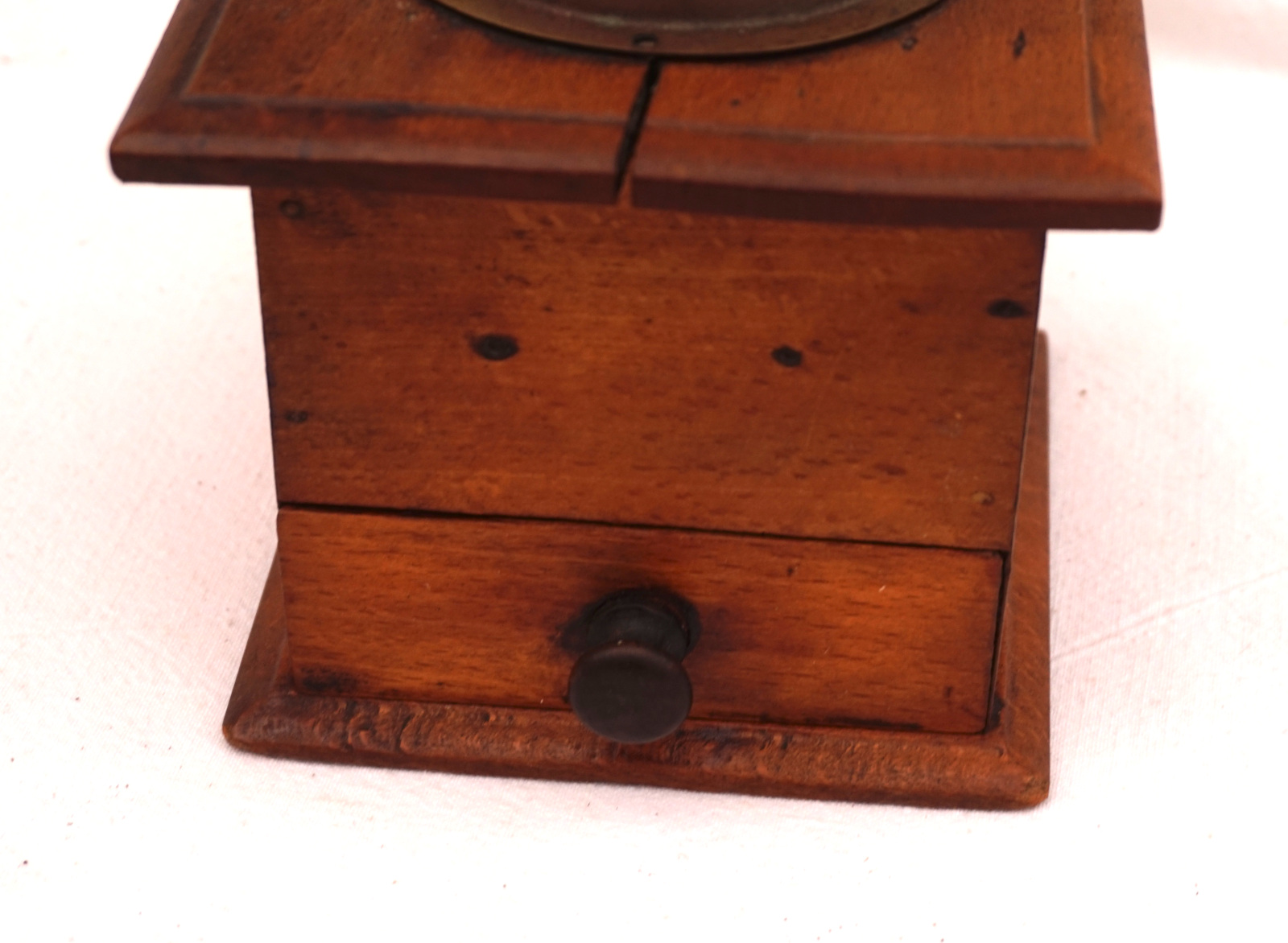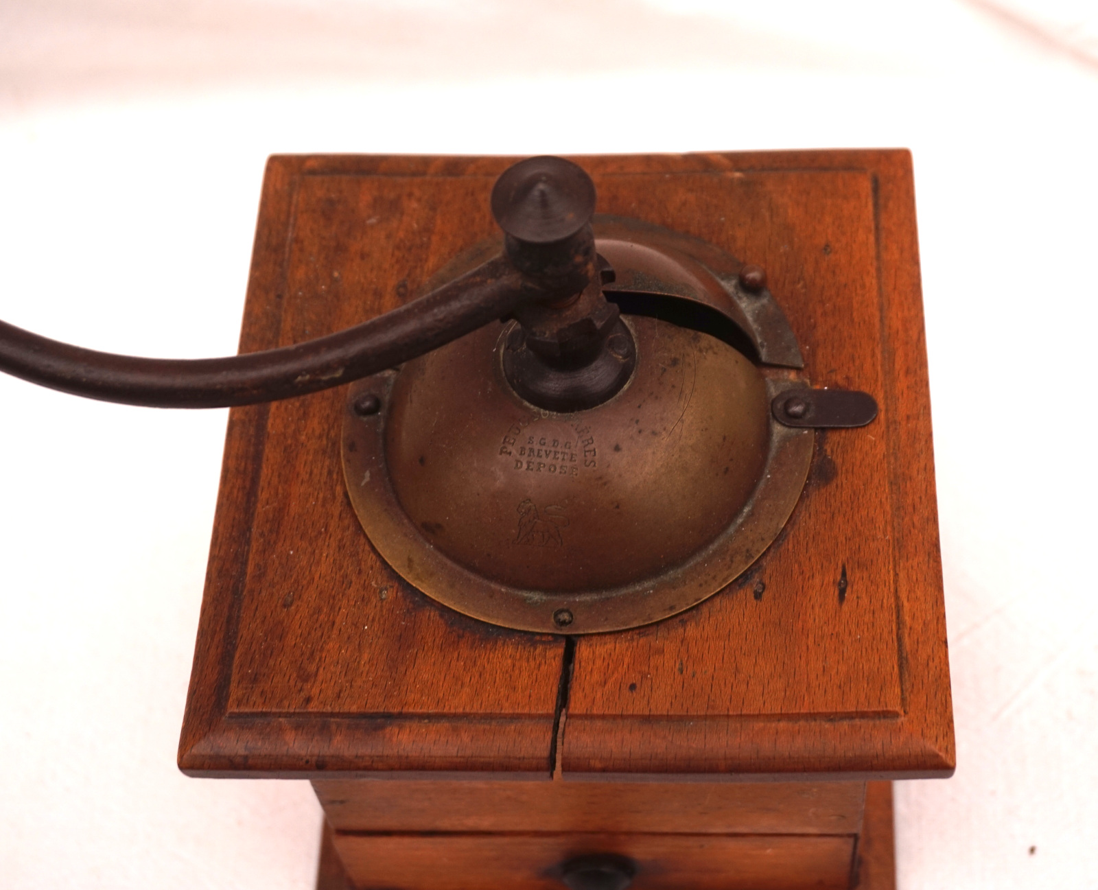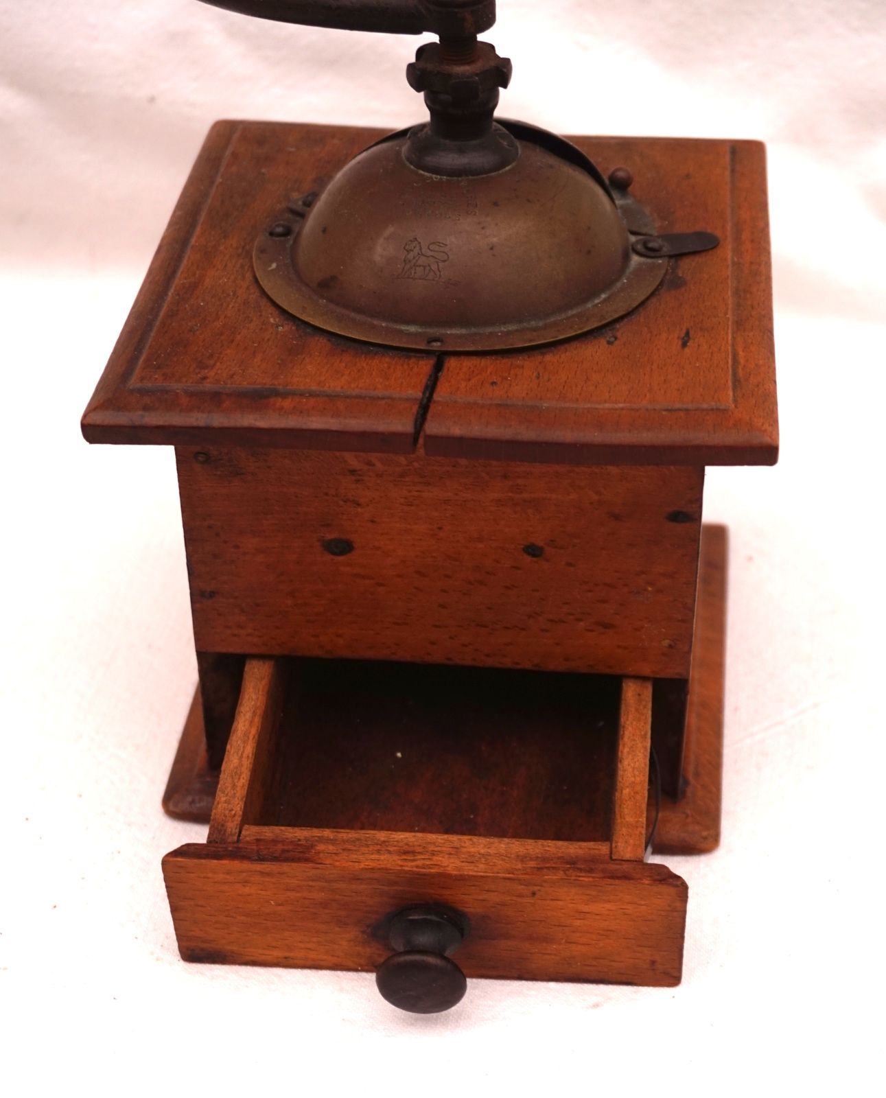 French coffee or pepper grinder in wood with brass lid stamped Peugeot Frères with lion,made by Peugeot Frères France during the 1900's. 7 1/2" (19.2cm) height, 4 7/8" (12.5cm) by side. Good condition.