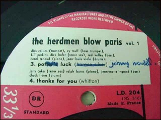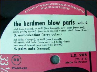 The original masters of Herdmen Blown Paris Volume 1 and Volume 2 recording by Vogue masters numbers MS316/ LD204 and MS318/LD205 with dick collins, cy touff, bill perkins, dick hafer, red kelley, henri renaud, jean-louis viale, jerry coker, ralph burns, jean-marie ingrand, chuck flores, jimmy gourley... Only the label of Vogue in front . The volume 1 is written for make corrections. Perfect correction with its original sleeves in cellophane.9"13/16 diameter