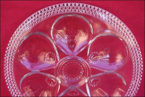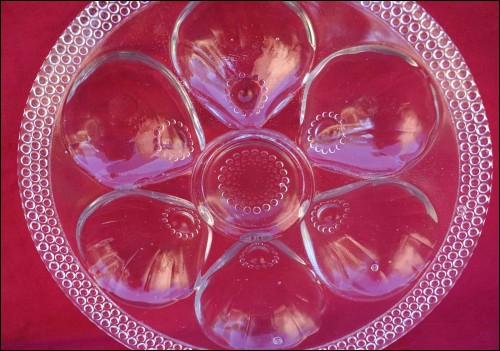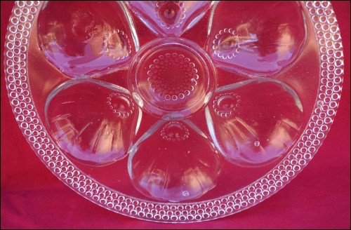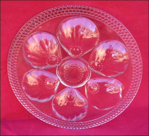 French pressed glass oyster plate made during the 1930's Art Deco period. It is shaped with 6 shell compartments and one central for the butter. The rim is beaded pressed. 9 3/4" (24.5cm) diameter. Perfect condition a few small bubbles in the glassas shown by the following pictures.