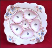 Rare 5 shell compartments and one central shaped scallloped oyster plate in austrian porcelain made by Marx and Gutherz factory in Carlsbad Austria during the 1900's. The transferware decor is enhanced with gilt edge and border.You can see the same plate in the Karsnitz book page 102. It's signed on the back. 8 7/8" (22.5cm) by side. Perfect condition as shown by the following pictures.