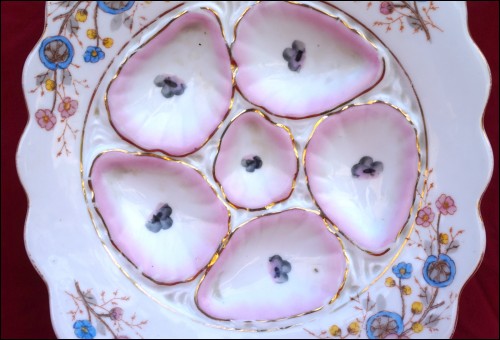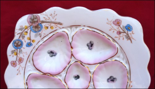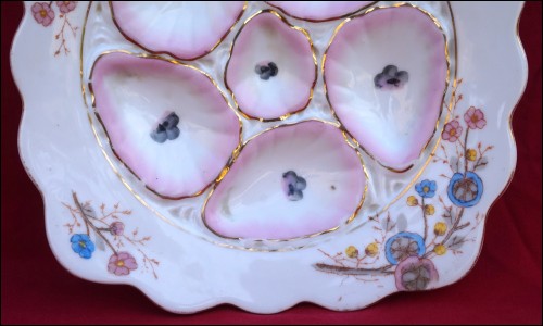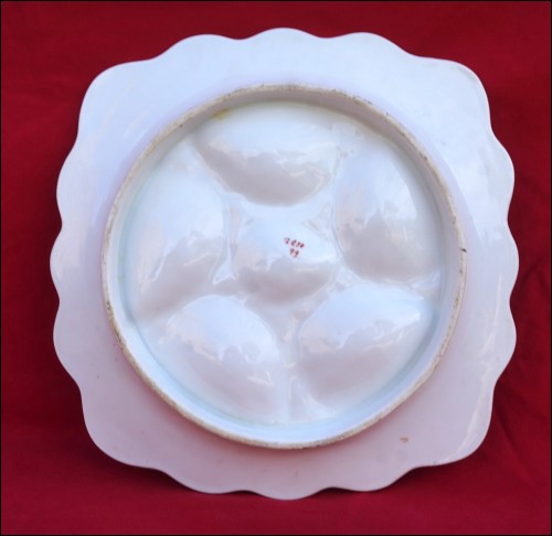 Assiette à huîtres en porcelaine de la manufacture autrichienne de Marx & Gutherz à Carlsbad vers 1890 (modèle similaire en page 102 sur le Karsnitz). De forme carrée, elle est à cinq compartiments pour les coquillages, décorée par transfert et rehaussée d'or. Très bel état. Largeur 22.5 cm.